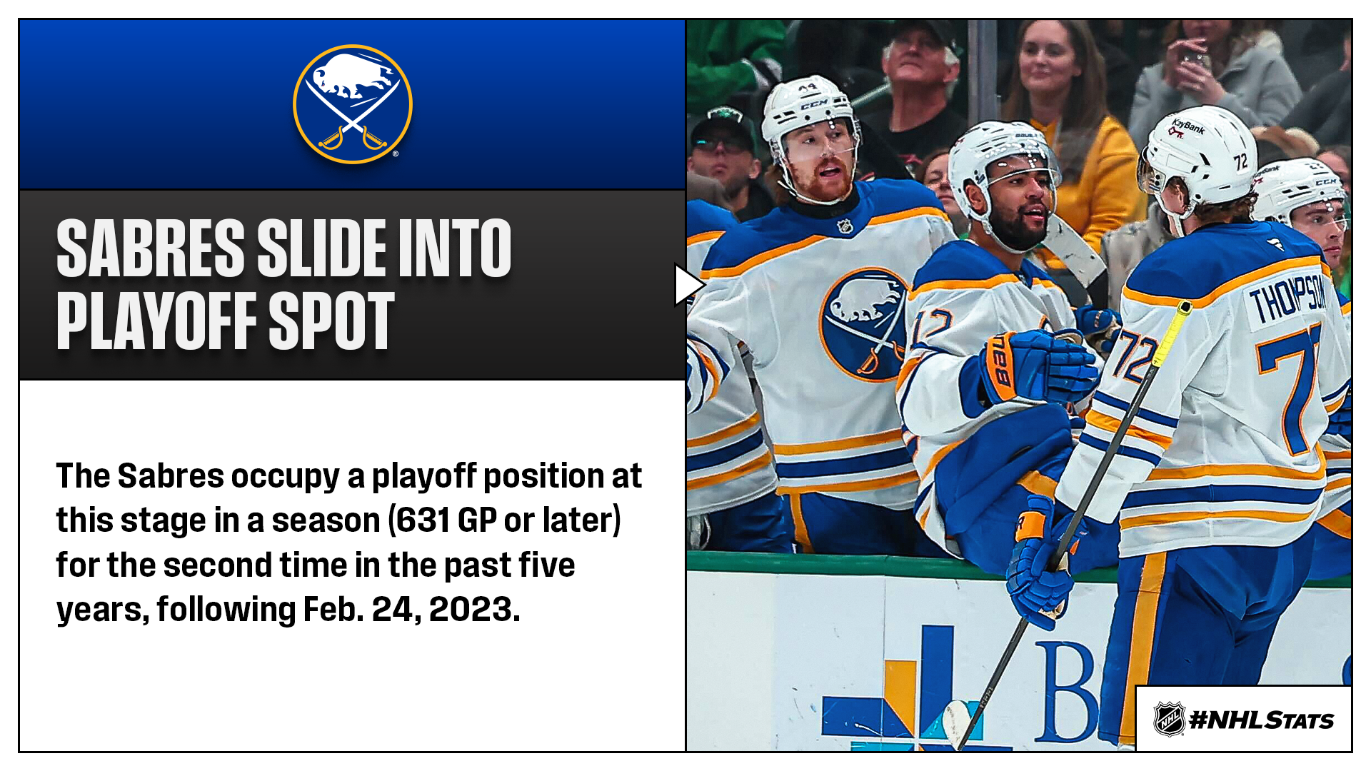 * The Sabres became the third team in the past five seasons to win 10 straight games after not qualifying for the playoffs in season prior (min. 82 GP). They joined the 2022-23 Devils (13 GP) – who were also led by Sabres head coach Lindy Ruff – and the 2024-25 Blues (12 GP).