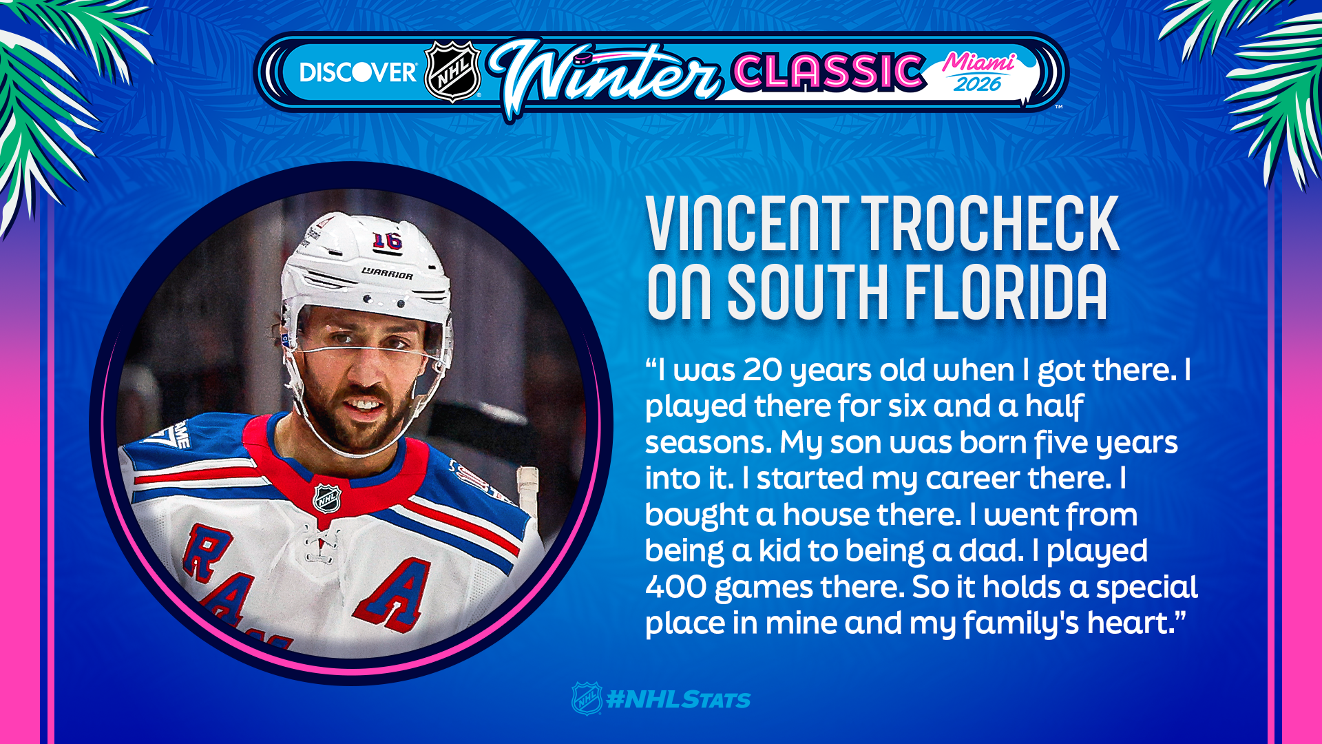 * Trocheck, who posted 2-1—3 in the 2024 Stadium Series to help New York become the first team in NHL outdoor history to earn a three-goal comeback win, spent his first six and a half NHL seasons with the Panthers and witnessed firsthand the growth of hockey in Florida – hockey registration has risen in the state by 49.63% since the franchise’s inaugural season (find more in the 2026 Discover NHL Winter Classic By The Numbers). The chance to play outdoors in the Sunshine State means a lot to Trocheck.