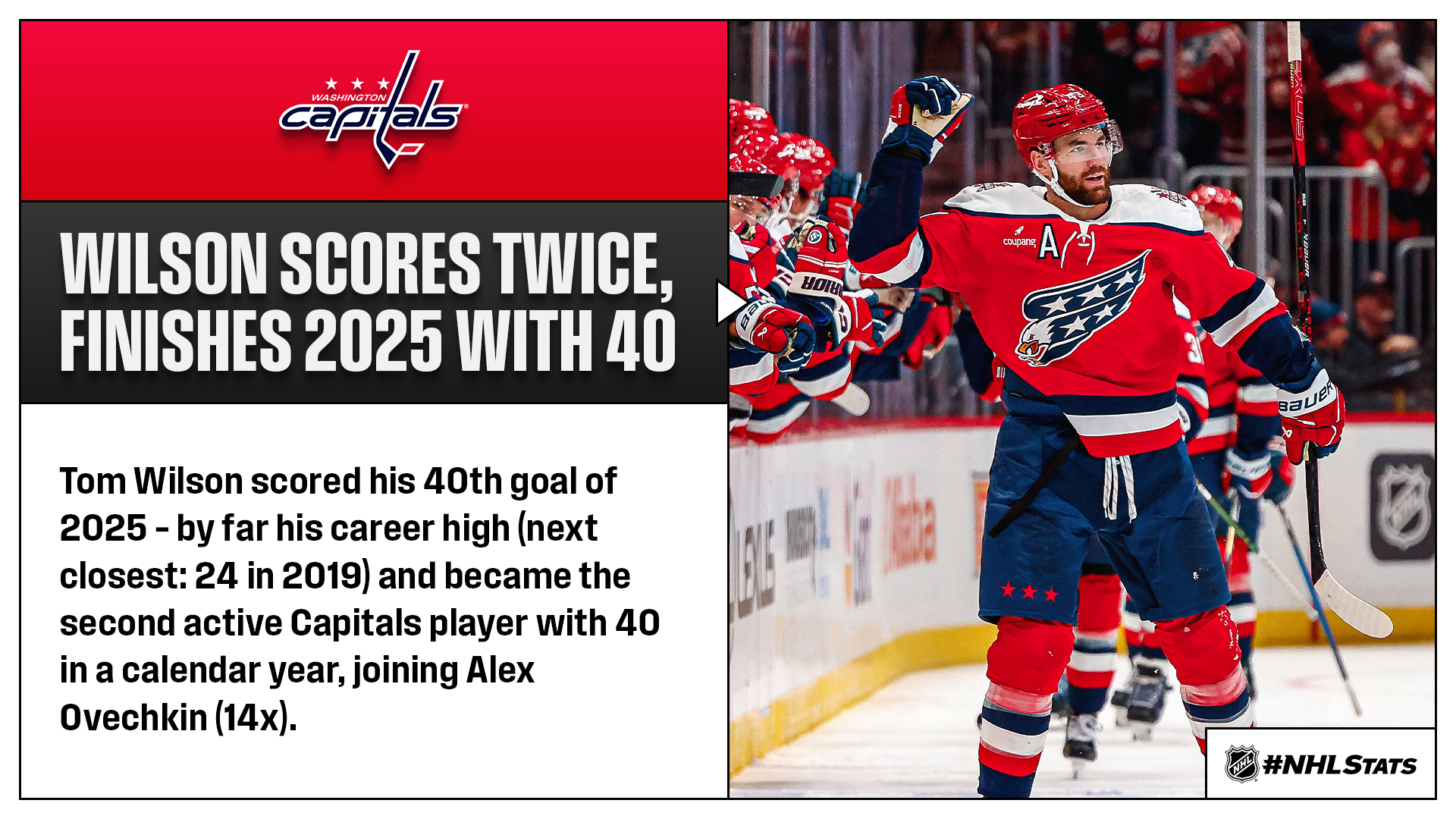 * Wilson (2-1—3) recorded his 15th career three-point outing, reached 200 NHL goals and 40 this calendar year to lift the Capitals (21-14-5, 47 points) to victory. Wilson became the sixth player to score 200 goals with the franchise and became the third member from the 2012 NHL Draft class to reach the mark alongside Filip Forsberg (334) and Tomas Hertl (267). Wilson is one of four forwards who did not represent his country at the 4 Nations Face-Off (also Celebrini, Bo Horvat & Nick Suzuki) who will be heading to Italy – the Capitals shared a video of him learning the news that he had made Team Canada’s roster.