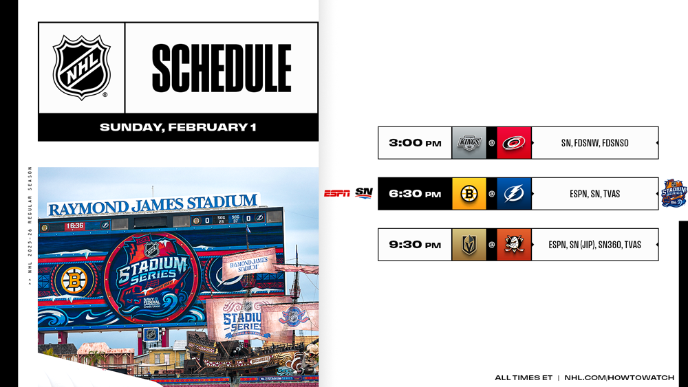 Lined up as first-round playoff opponents based on the standings entering Sunday before the 2026 Navy Federal Credit Union NHL Stadium Series, Nikita Kucherov and the Lightning (34-14-4, 72 points) will clash with David Pastrnak and the Bruins (32-20-3, 67 points) for the 45th outdoor game in League history and first hosted by Tampa Bay (6:30 p.m. ET on ESPN, SN, TVAS; NHL in ASL on ESPN+, Sportsnet+).