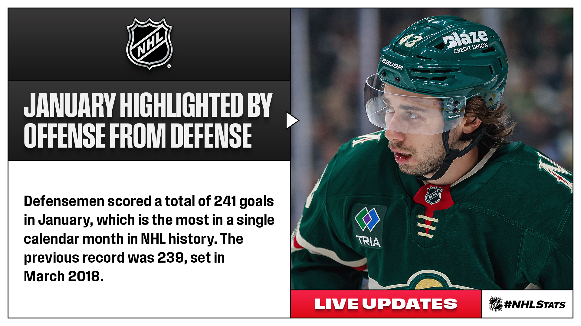The latest edition of #NHLStats: Live Updates covered all the major stats and storylines from the last day of January, including an all-time NHL mark by defensemen, the League’s first 40-goal scorer of the season and milestones among many others.