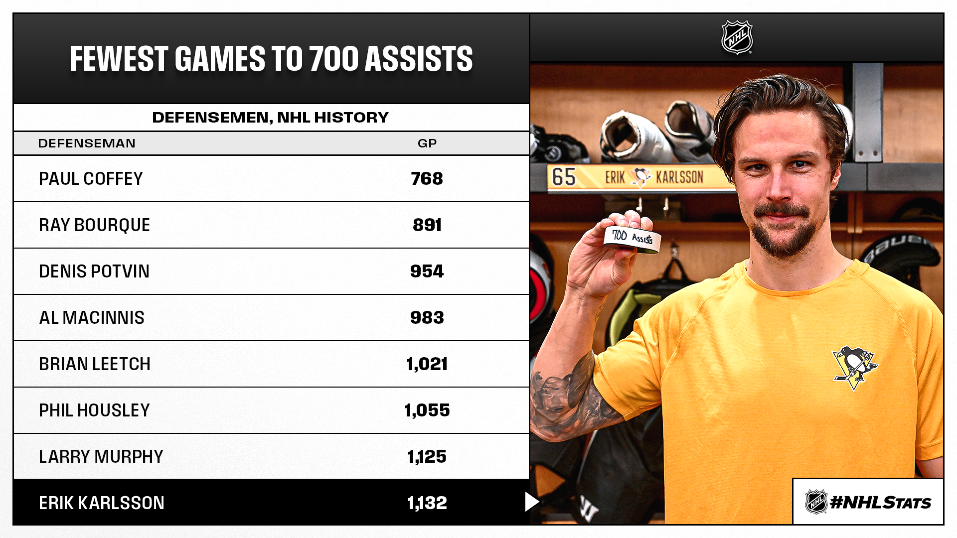 * Karlsson (0-1—1) factored on one of six Pittsburgh goals to reach the 700-assist milestone as the Penguins extended their win streak to six games and improved their point percentage since the holiday break to .824 – the second best among all teams behind only the Lightning (.906). Karlsson, who will represent Sweden at the upcoming Olympic Winter Games Milano Cortina 2026, became the second Swedish defenseman in NHL history to hit 700 assists, joining Lidstrom (878).