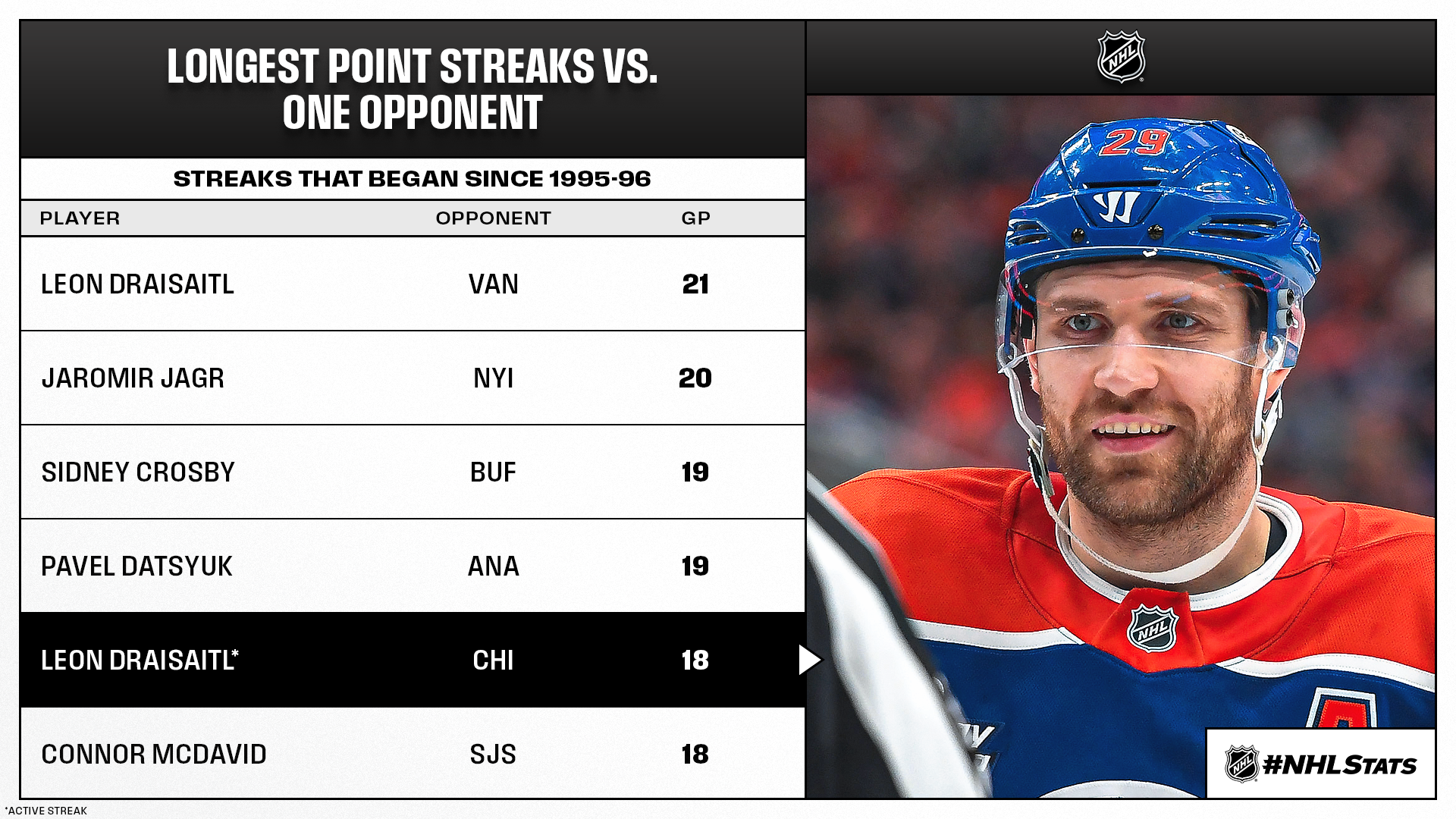 * McDavid (364-732—1,096) enters the matchup four points back of the 1,100-point milestone – he ranks second among active players in four-point outings (41 GP) behind only Sidney Crosby (43 GP). Meanwhile, his teammate, Leon Draisaitl, will look to continue his success against Chicago – a club he has recorded a point against in his past 18 meetings dating to Oct. 28, 2018.
