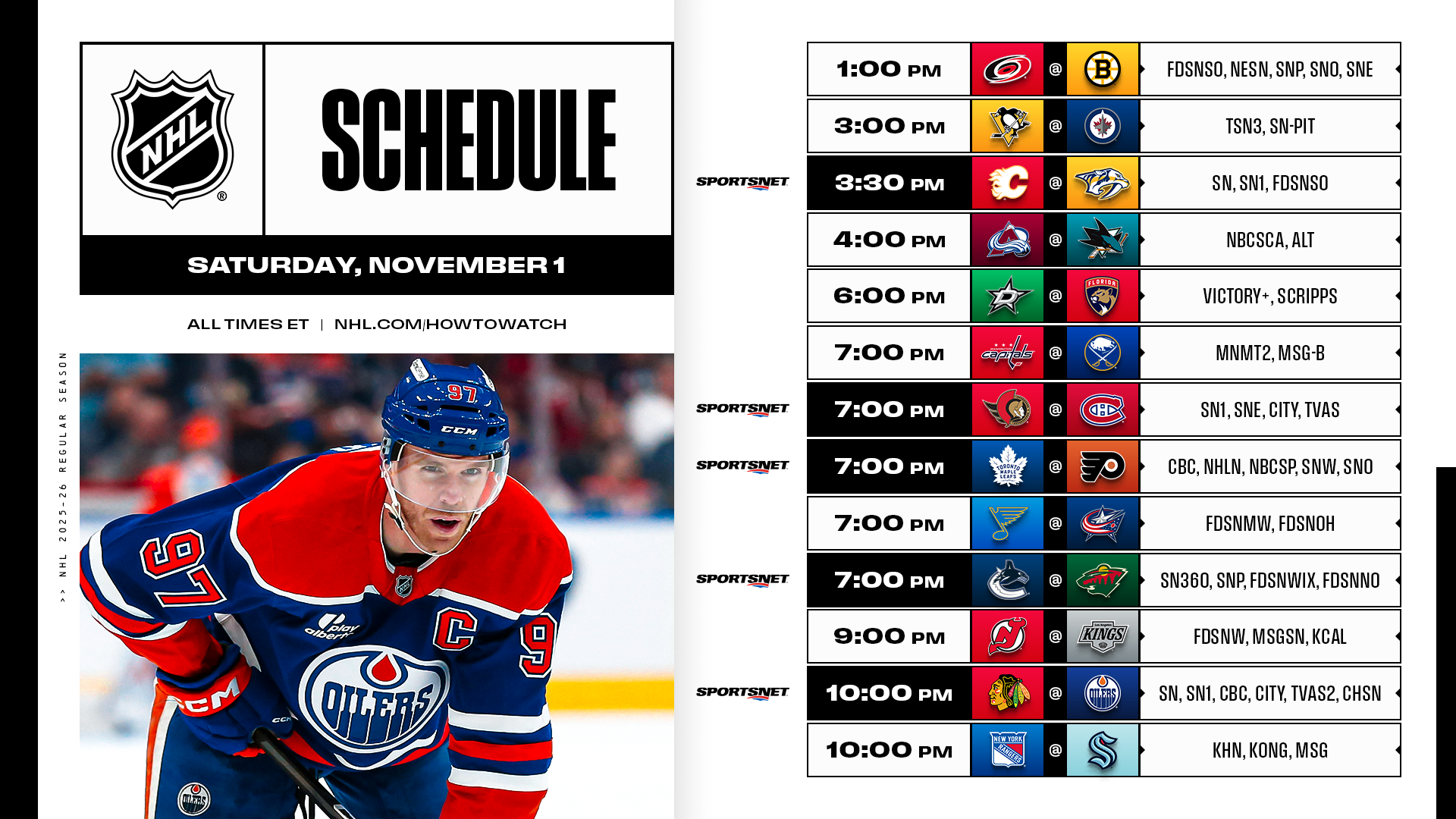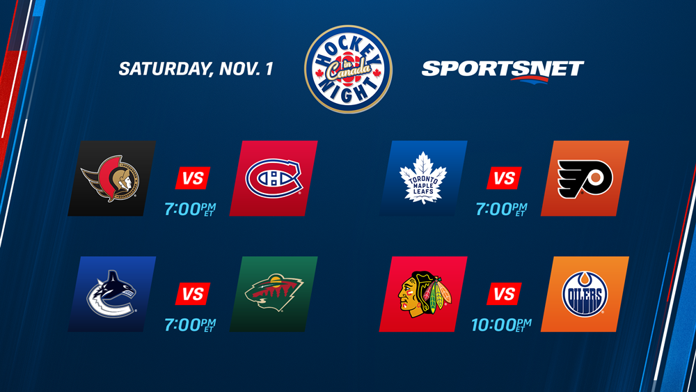 * Saturday’s 13-game schedule includes four Hockey Night in Canada contests capped by the latest meeting between No. 1 picks Connor Bedard and Connor McDavid.