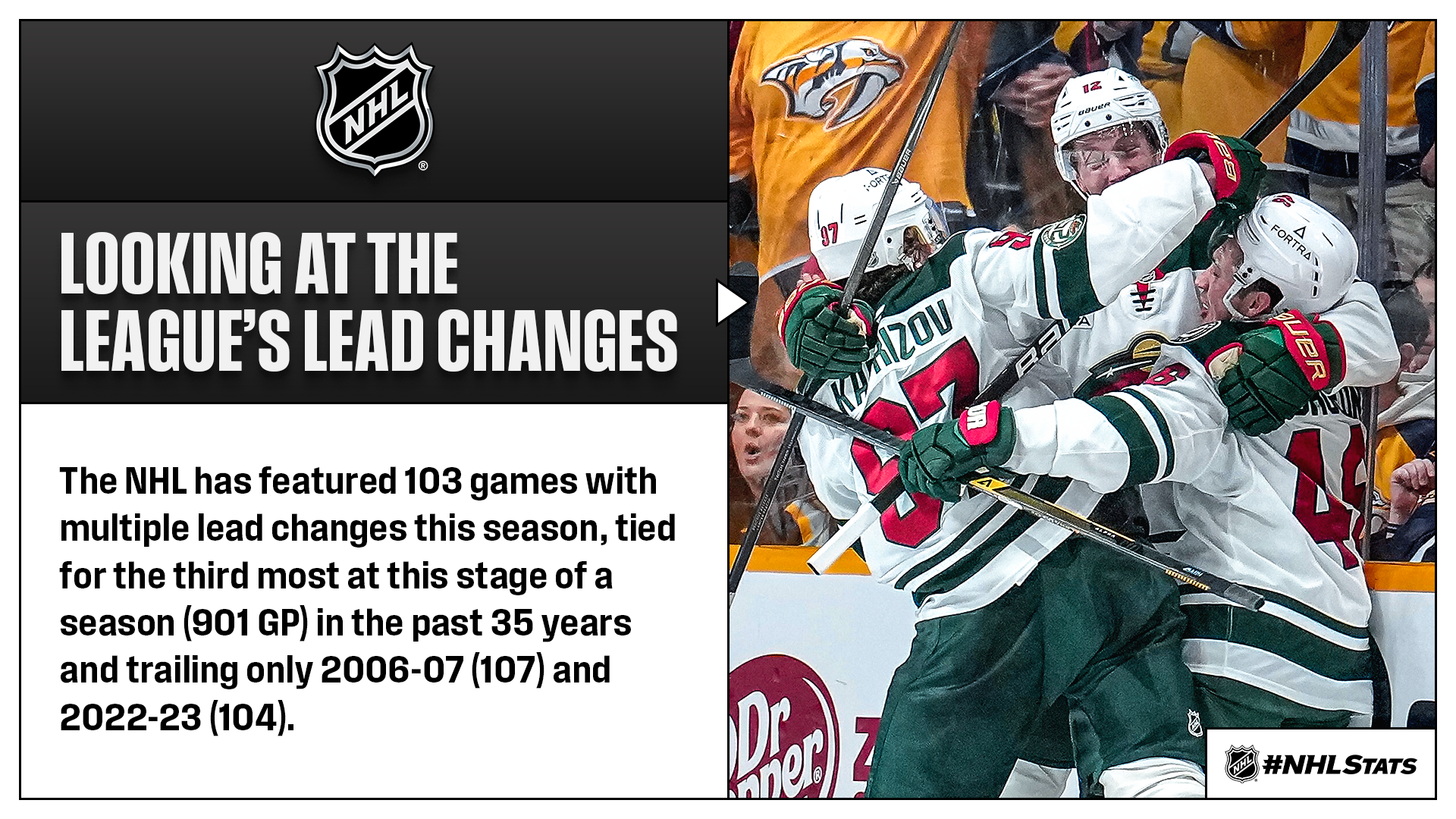The Wild and Predators combined for six goals in the first period, highlighted by Matt Boldy’s fourth career hat trick within the opening 12:58 of play, and then traded leads in the second and third period before Boldy (3-1—4) and Kirill Kaprizov (0-1—1) collected assists on Jared Spurgeon’s game-winning goal in the final minute of overtime. Minnesota-Nashville (2) was one of two games to feature multiple lead changes Wednesday (FLA-BOS: 2).
