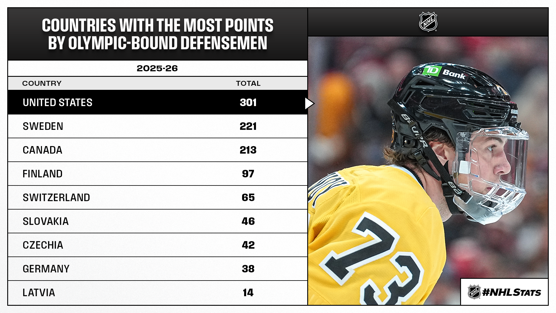 * Charlie McAvoy (Team USA) collected an assist to extend his point streak to seven games (1-9—10) in his final contest before heading to Milan. McAvoy tied the sixth-longest point streak by an Olympian heading into the Olympic break – on a list that includes two active runs by his soon-to-be American teammates (Quinn Hughes: 10 GP & Zach Werenski: 7 GP). Notably, Rasmus Dahlin and Tim Stützle both enter Thursday on a six-game streak.