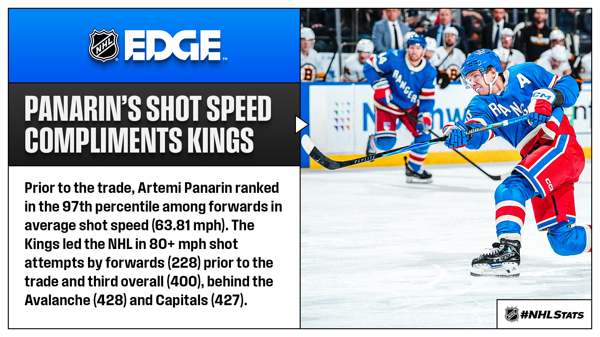 * The Kings (23-18-14, 60 points) acquired Artemi Panarin to benefit their push to the 2026 Stanley Cup Playoffs, who concluded his tenure with the Rangers with the highest point-per-game rate in franchise history (1.26 P/GP). Overall, Panarin is one of five players with at least 900 career points since his NHL debut in 2015-16.