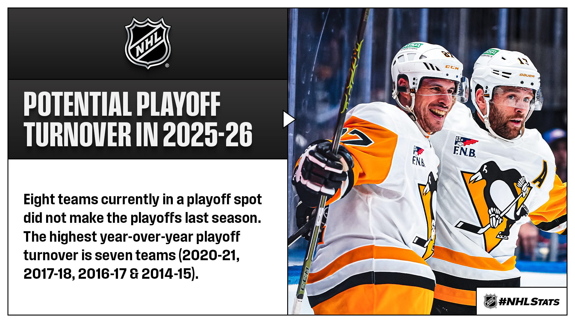 * The Blue Jackets became the fifth team to record a winning streak of seven-plus games this season after not competing in the Stanley Cup Playoffs in 2025, following the Ducks (2x; 7 GP), Sabres (10 GP), Bruins (7 GP) and Mammoth (7 GP). The only other campaign to feature as many was 2021-22: Flames (10 GP), Ducks (8 GP), Canucks (7 GP), Stars (7 GP), Rangers (7 GP) and Kings (7 GP).
