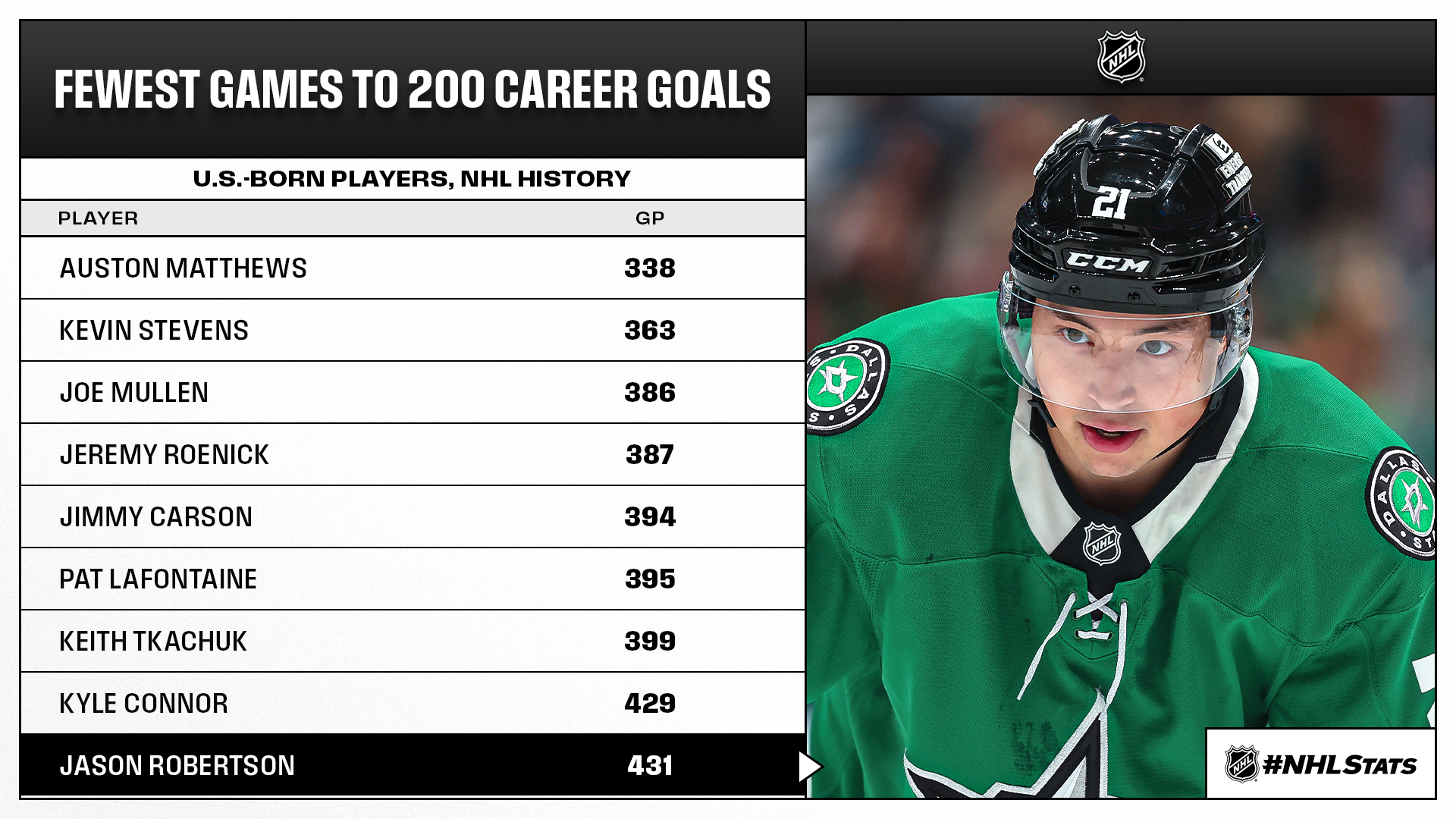 * Robertson scored his 200th career goal (200-259—459 in 431 GP) and became the 12th player to reach the mark with the Stars/North Stars. Robertson became the second-fastest player to reach the milestone with the franchise behind only Dino Ciccarelli (381 GP), while also becoming one of the fastest U.S.-born players to do so in NHL history.