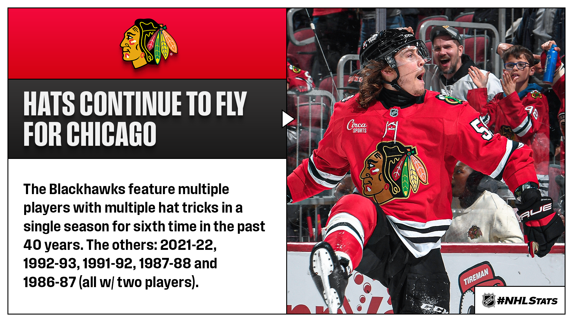 * Tyler Bertuzzi lifted the Blackhawks to victory in overtime with his second hat trick of the season. He is one of five players with multiple three-goal performances this season, including teammate Connor Bedard (2x).