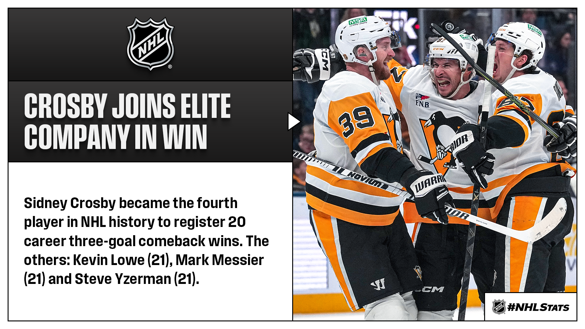 Sidney Crosby factored on the game-tying goal in the final seconds of regulation and scored the winner in overtime to help the Penguins rally past the Blue Jackets. He joined rare company in NHL history in the process with his 20th career three-goal comeback win.