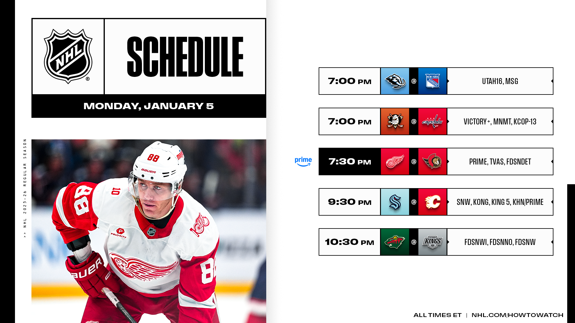 * The Red Wings and Senators headline the latest edition of Prime Monday Night Hockey as Patrick Kane closes in on the 500-goal milestone and the most points by a U.S.-born skater in NHL history.