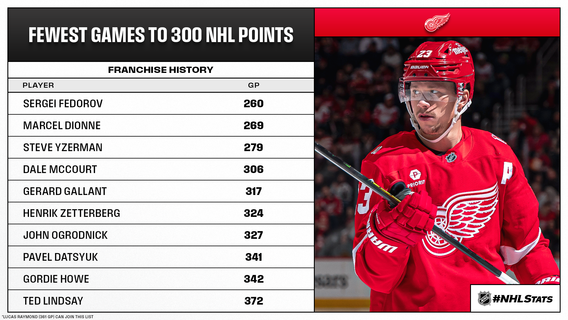 * Lucas Raymond (109-189—298 in 361 GP), Detroit’s leading scorer this season, needs two points to reach the 300-point mark. He can become the third Red Wings player in the past 30 years to record 300 NHL points before his 400th career game and would join Henrik Zetterberg (324 GP) and Pavel Datsyuk (341 GP).