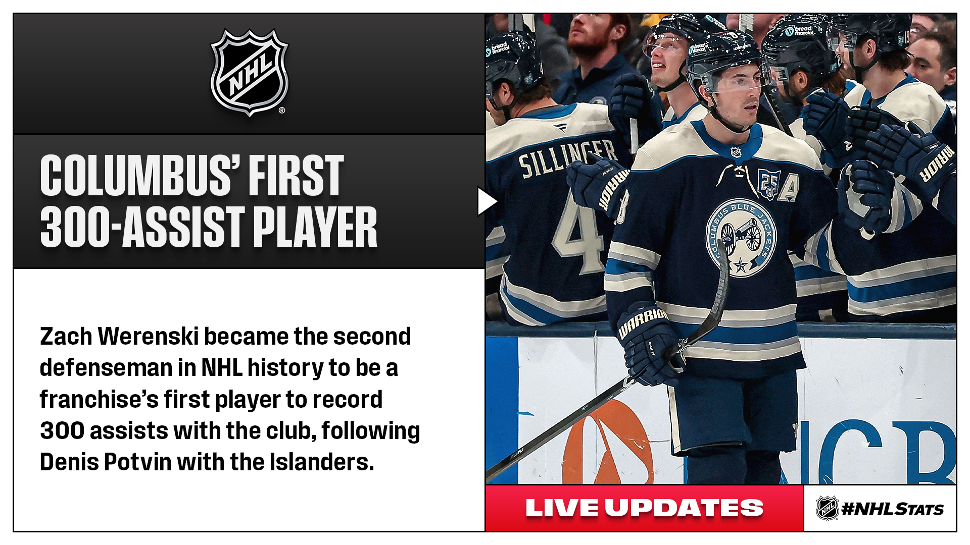 * Werenski (1-1—2), who became the first player in franchise history to reach 300 career assists, recorded multiple points in his fifth consecutive game and matched Artemi Panarin (5 GP in 2017-18) for the longest run in Blue Jackets history; Cale Makar (5 GP in 2023-24) is the last defenseman to achieve this feat while Mike Green (6 GP in 2008-09) was the last with a longer stretch.
