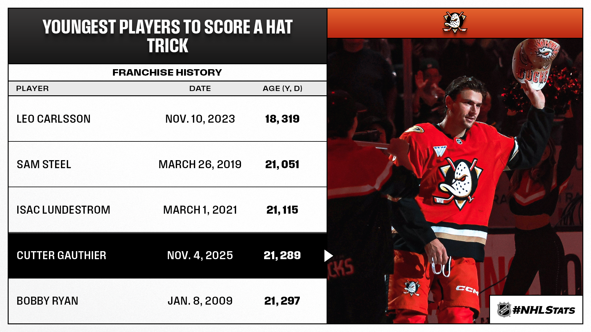 * Gauthier recorded his 10th goal of 2025-26 and matched Corey Perry (12 GP in 2014-15), Steve Thomas (12 GP in 2002-03) and Paul Kariya (12 GP in 1995-96) for the fewest games to that many goals in a season by a Ducks player. He also became the fastest player to reach the mark at age 21 or younger since Auston Matthews (6 GP) and Elias Pettersson (10 GP) in 2018-19.