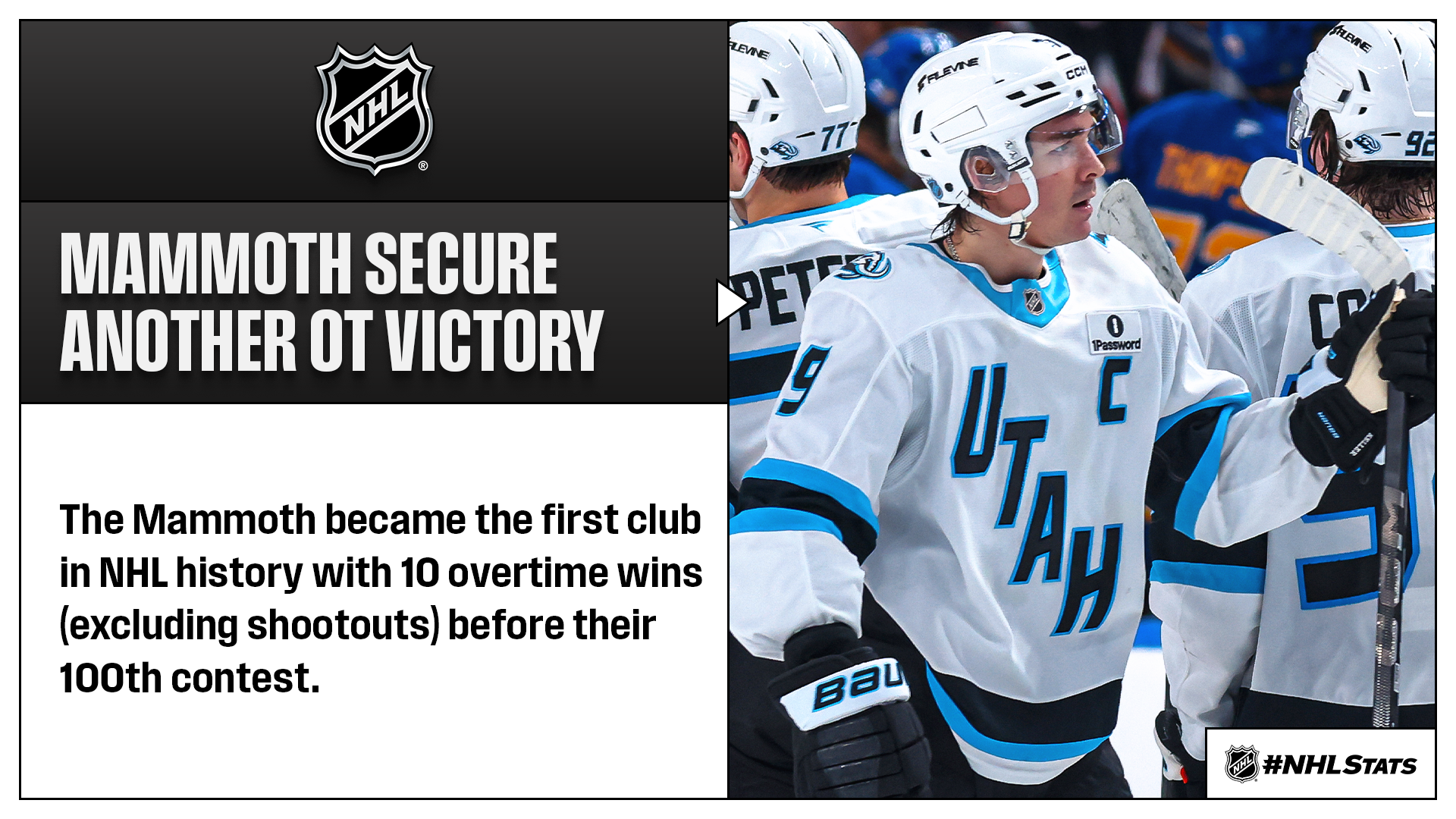 * Clayton Keller (1-1—2) assisted on the game-opening goal and later scored the winner in extra time to help the Mammoth earn the 10th overtime victory in franchise history. Utah’s three overtime wins this season are tied with San Jose for the second most, behind only Montreal (5).