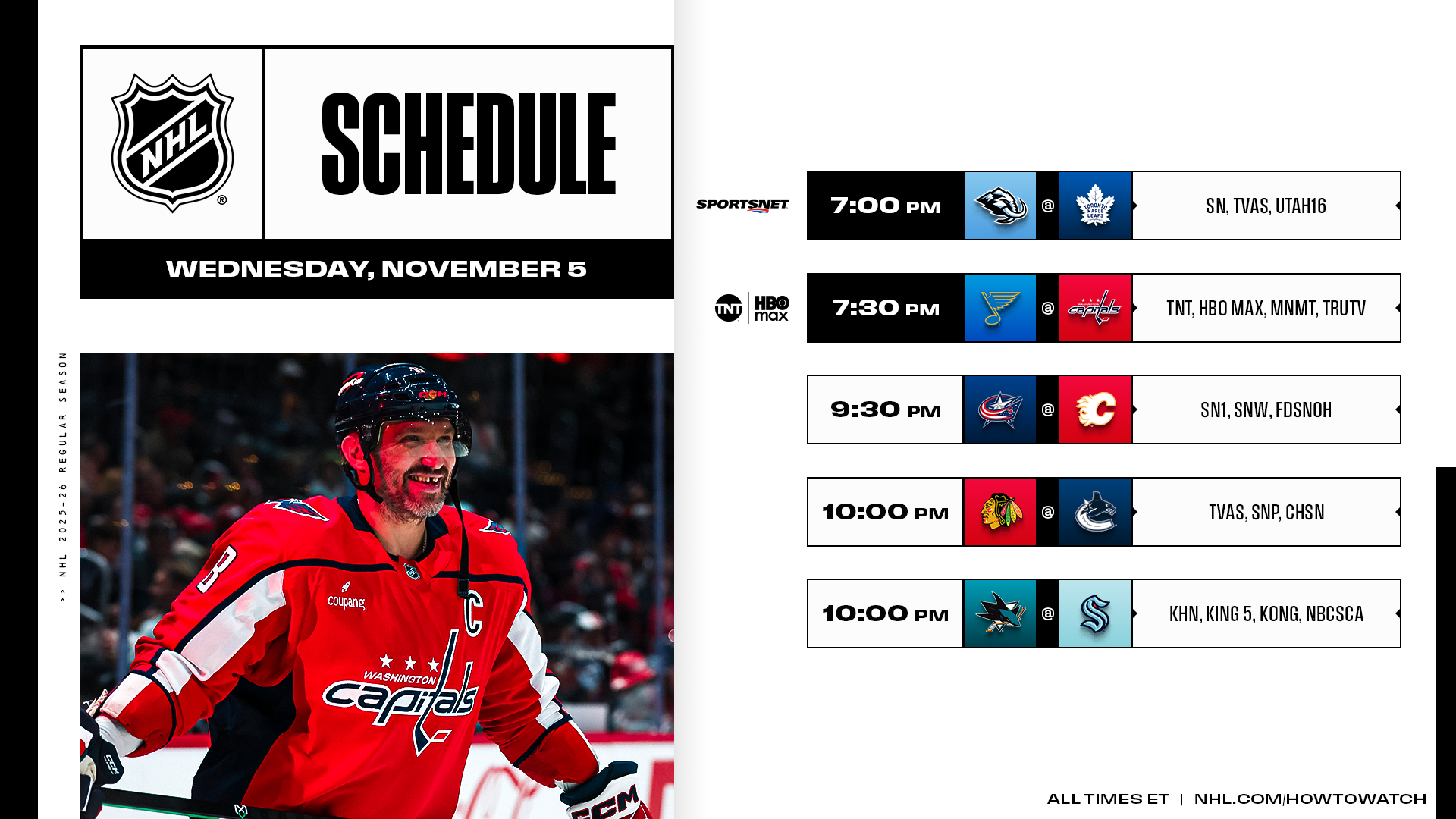 * Wednesday’s five-game slate opens with national telecasts in Canada and the U.S., with the Mammoth visiting the Maple Leafs on Sportsnet followed by the Capitals hosting the Blues on TNT.