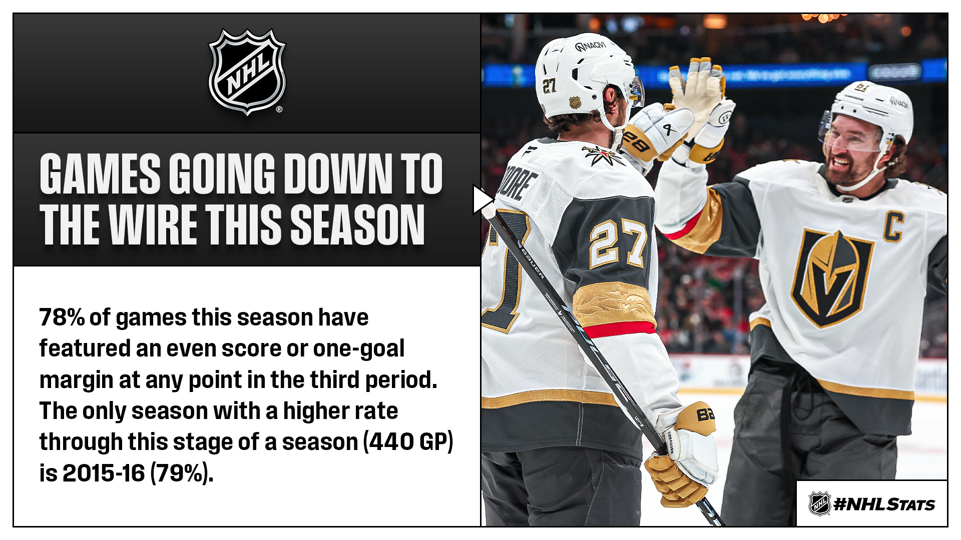 * 78% of games this season have featured an even score or one-goal margin at any point in the third period, with the Stars, Golden Knights, Mammoth and Ducks each adding to that total Friday night.