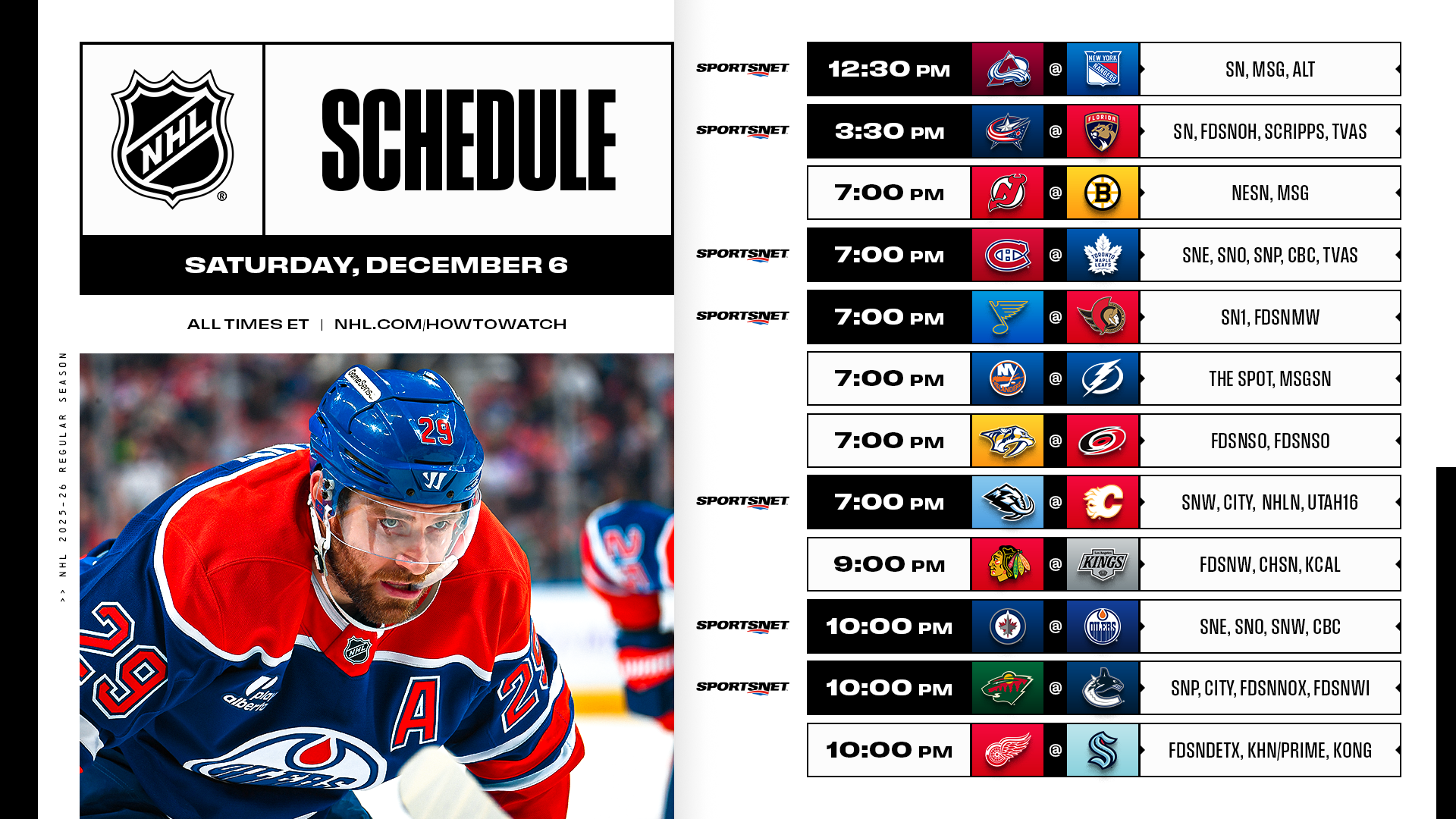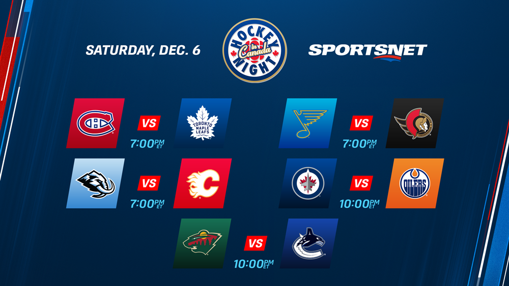 For the first time this season, all seven Canadian teams will hit the ice on the same Hockey Night in Canada broadcast, with Sportsnet’s family of channels airing five games including two all-Canadian matchups between the Canadiens and Maple Leafs as well as the Jets and Oilers.