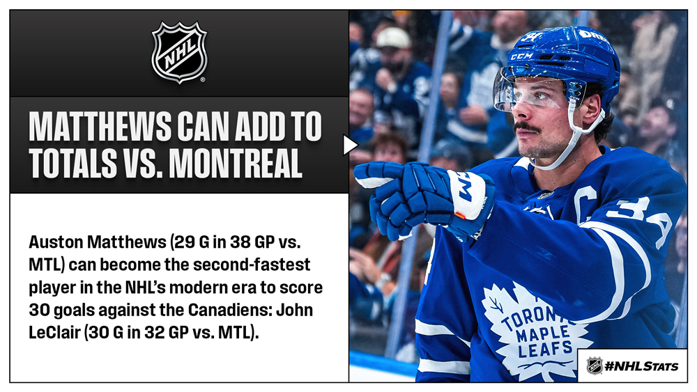 * Auston Matthews (29-18—47 in 38 GP) enters play with the most goals and points against the Canadiens since entering the League in 2016-17. His 29 goals against Montreal are his most against an opponent and should he score his 30th, he would become the second active player to score 30 goals in fewer than 40 games against a franchise (also Alex Ovechkin in 36 GP vs. TOR).