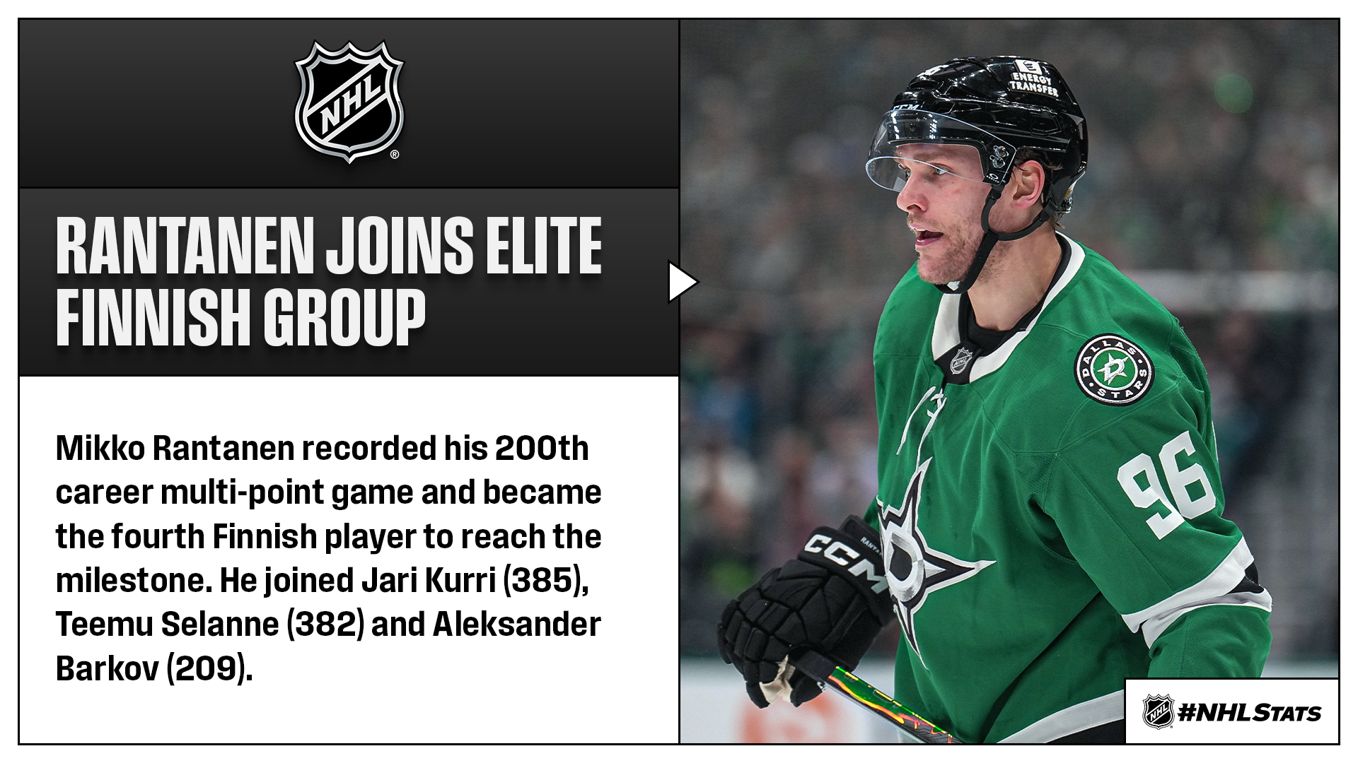 * Rantanen (680 GP) became the seventh-fastest active European player to record 200 career multi-point games. He trails Alex Ovechkin (570 GP), Evgeni Malkin (625 GP), Leon Draisaitl (627 GP), Artemi Panarin (628 GP), Nikita Kucherov (632 GP) and David Pastrnak (652 GP).