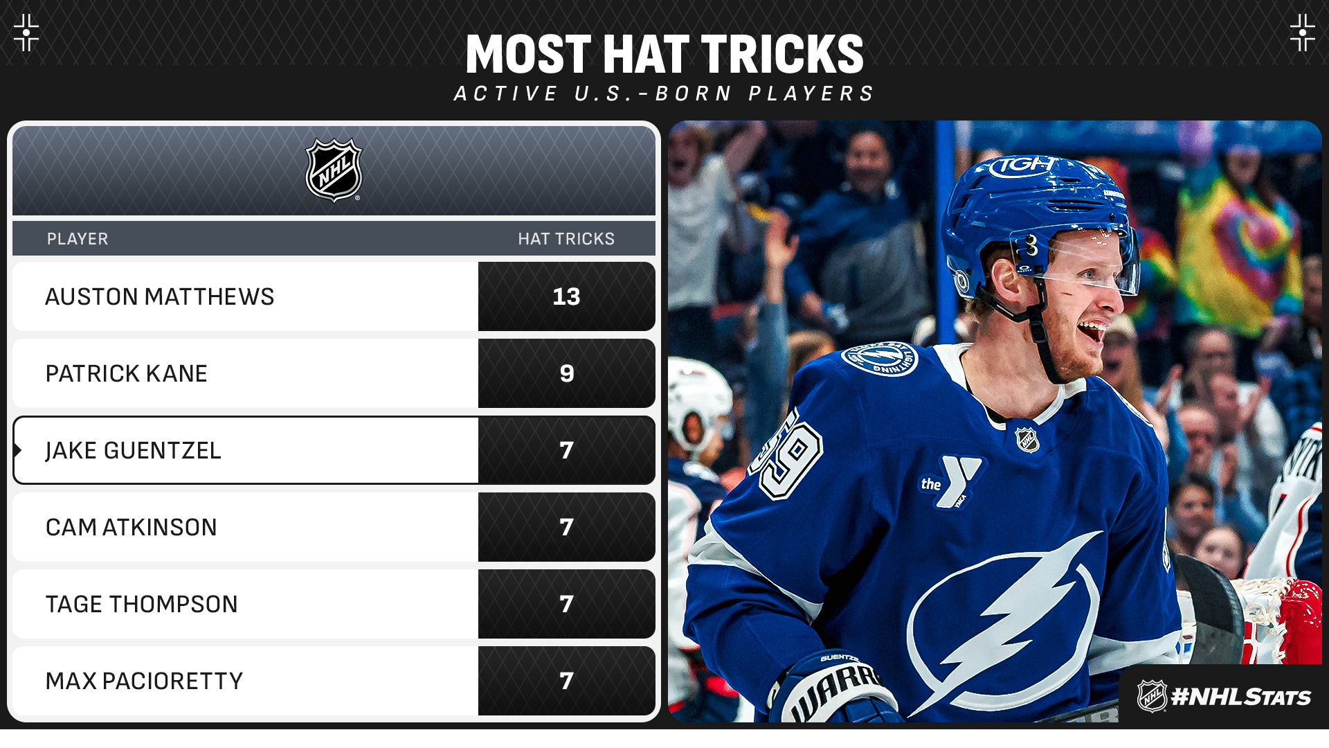 * Jake Guentzel scored his seventh career hat trick – tied for the third most among active U.S.-born players – in a contest that saw 11 combined goals, four tying tallies and the Lightning overcoming a multi-goal deficit.