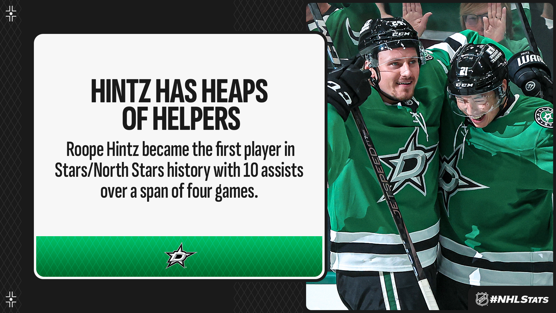 * Hintz boosted his totals over his past four games to 2-11—13 and became the first player in Stars team history with 13 or more points over a span of as many contests. He also became the first player in Stars/North Stars history with multiple assists in four straight games.
