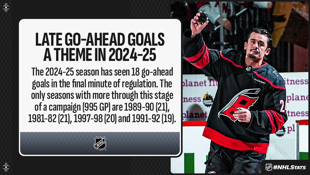 * Sebastian Aho (1-0—1) opened the scoring with his 20th career shorthanded goal but with a tie game late in the third period, Jarvis (1-0—1) scored the winning goal with 19 seconds left on the clock to help the Hurricanes improve to 37-22-4 (78 points). Jarvis tied Aho (59:41 on Feb. 22, 2024) for the fifth-latest go-ahead goal in franchise history, behind Ray Whitney (59:59 on Oct. 13, 2006), Ron Francis (59:58 on Dec. 3, 1986), Blaine Stoughton (59:51 on March 29, 1983) and Justin Faulk (59:43 on Dec. 6, 2015).