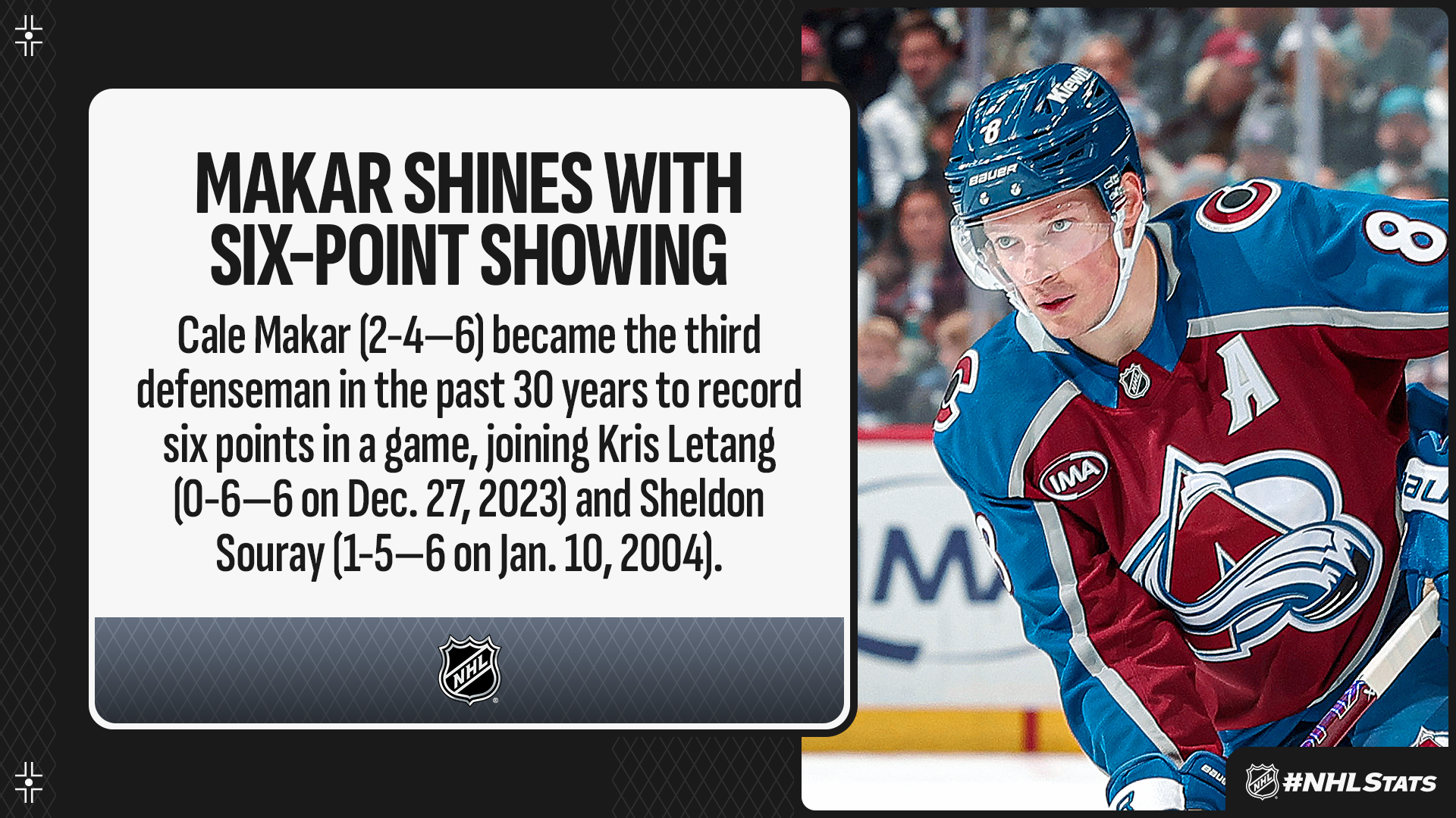 * A high-flying outing for the Avalanche saw Cale Makar become the third defenseman in the past 30 years with a six-point game and the fifth-fastest blueliner in NHL history to 300 assists, while teammate Nathan MacKinnon tied the second-most five-point outings in franchise history.