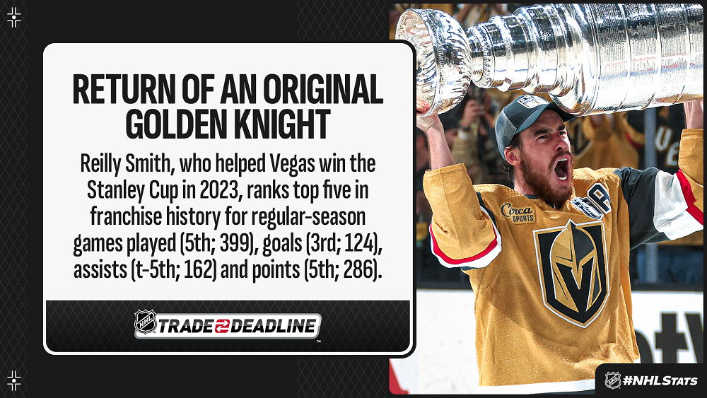 * With less than 24 hours until the Trade Deadline, the Golden Knights brought back Reilly Smith in a trade with the Rangers. Smith, one of the original Vegas “Misfits,” helped the franchise reach the Stanley Cup Final twice (winning in 2023). Another major move Thursday included Brock Nelson being traded to the Avalanche after spending the first 12 years of his career with the Islanders. Nelson was selected by the club 30th overall in the 2010 NHL Draft and amassed 295-279—574 in 901 games.