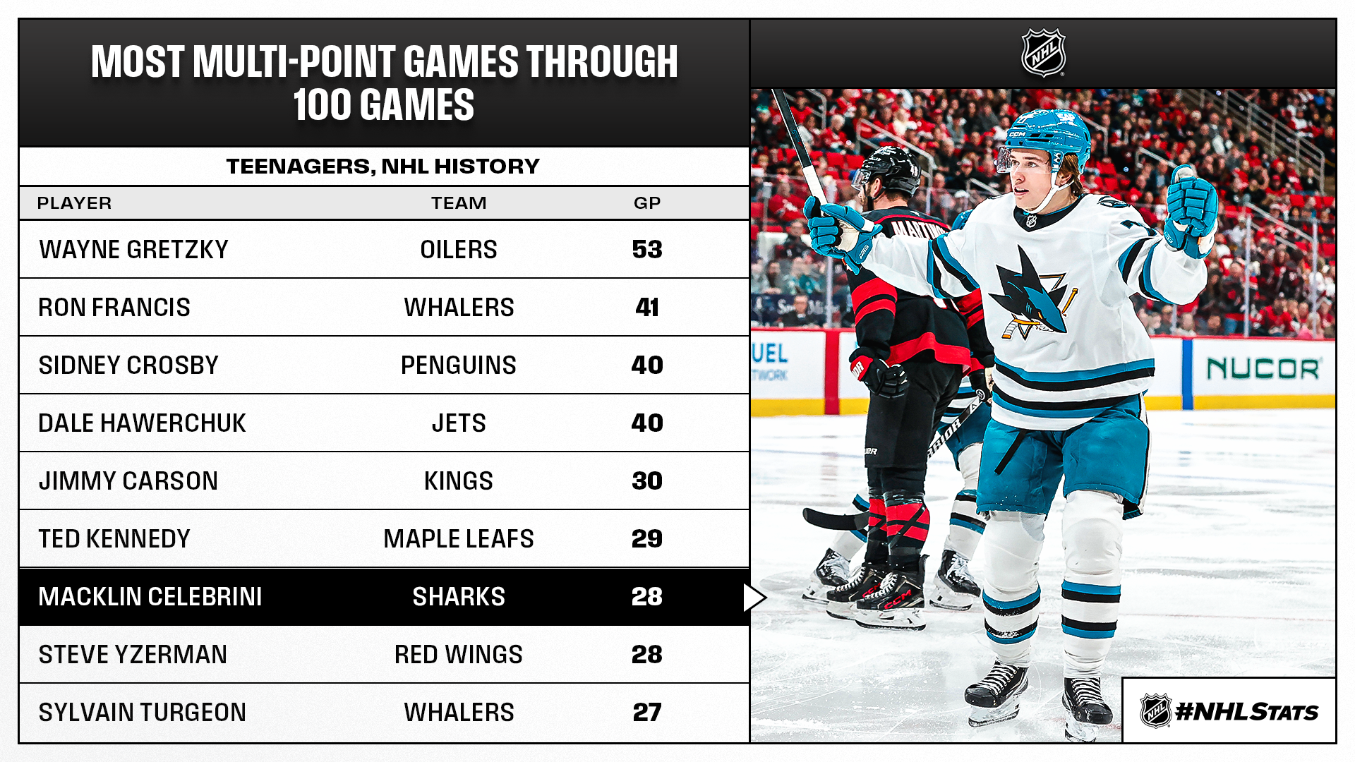 * Celebrini boosted his career totals to 40-66—106 and leapfrogged Ted Kennedy (104) for the seventh-most points by a teenager at the time of their 100th NHL game. Celebrini also surpassed Phil Housley (64) for the sixth-most assists by a teenager at the time of that milestone behind Wayne Gretzky (112), Sidney Crosby (83), Ron Francis (82), Dale Hawerchuk (72) and Steve Yzerman (67).