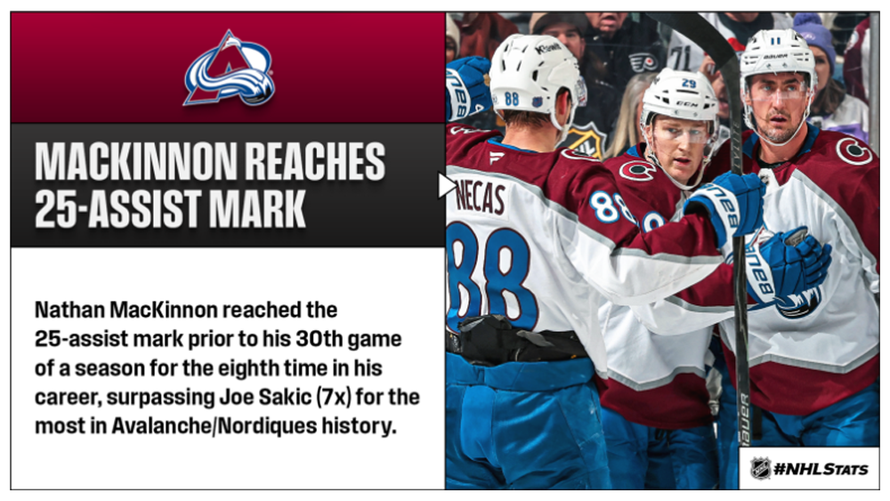 * MacKinnon (24-25—49 in 29 GP) recorded his 25th assist of 2025-26 – tied for the fifth most in the NHL – and reached the mark prior to his 30th game in a season for the eighth time in his career. MacKinnon became the fifth player in Avalanche/Nordiques history to register 49 or more points prior to their 30th contest, joining Marian Stastny (56 in 1982-83), Peter Forsberg (53 in 1995-96), Peter Stastny (53 in 1987-88 & 1982-83) and Michel Goulet (49 in 1987-88). Meanwhile, his teammate Brent Burns (1-0—1) wrote his name among legends as he surpassed Nicklas Lidstrom (264) for the eighth-most goals by a defenseman in NHL history.