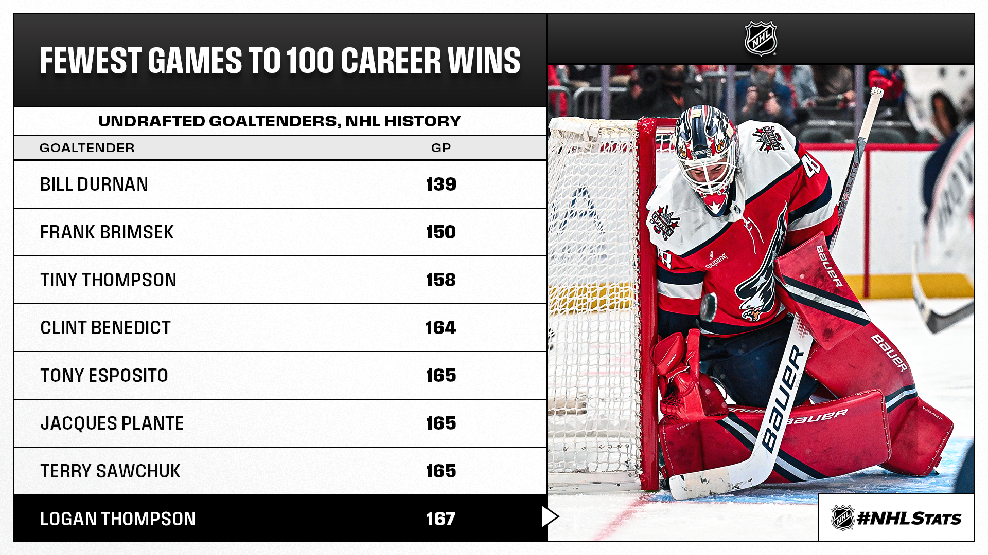 * Logan Thompson required the eighth-fewest games to 100 wins among undrafted goaltenders in NHL history.