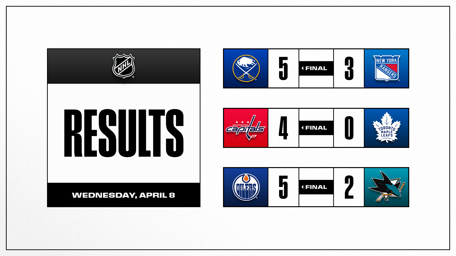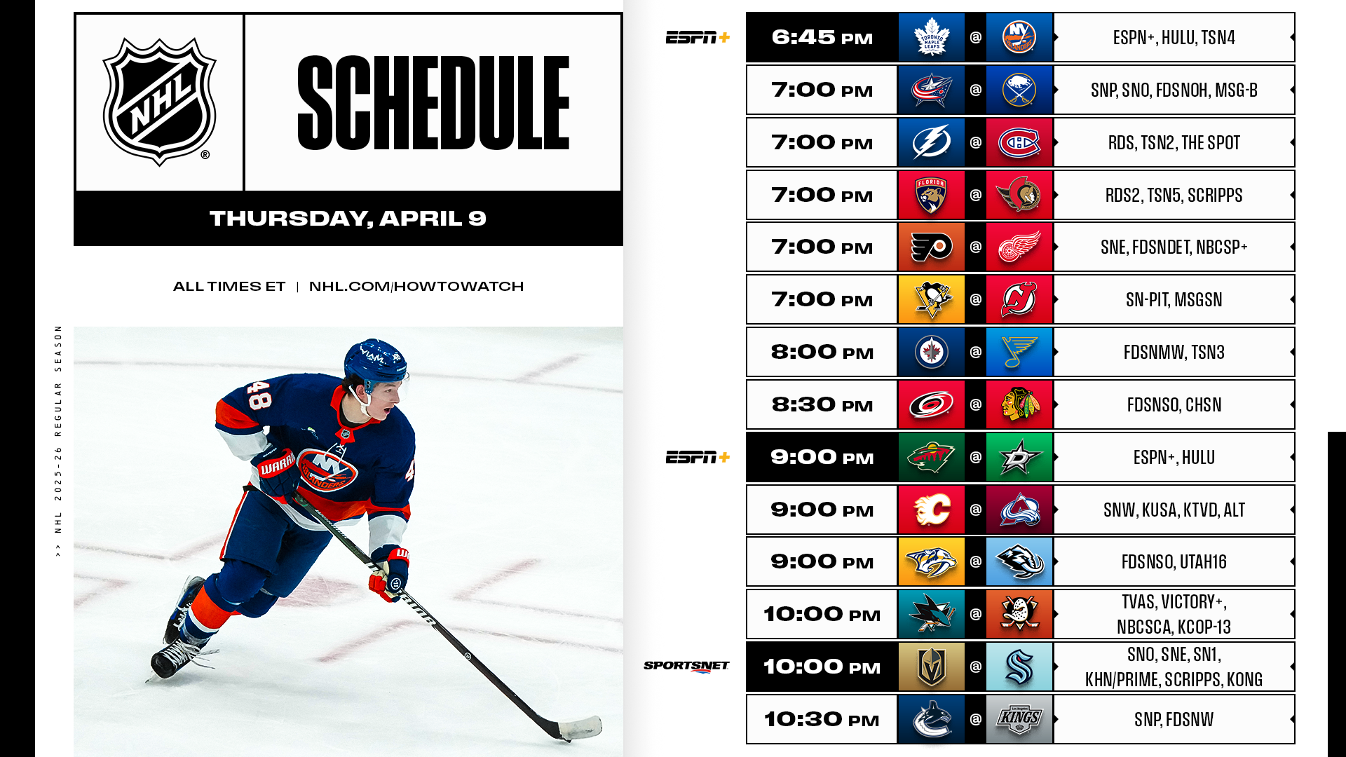 Thursday’s 14-game slate gets an early start (6:45 p.m. ET) as it marks one week until the end of the regular season – with still plenty to be determined. There are nine more playoff spots up for grabs and vying for one of them are the Islanders, who face the Maple Leafs in the first half of an ESPN+ and Hulu doubleheader – with the closer being between the only known matchup for the First Round. With 14 more playoff seeds to be finalized, the Stars and Wild are confirmed to meet when the 2026 Stanley Cup Playoffs begin April 18 (but home ice in that series is still to be determined).