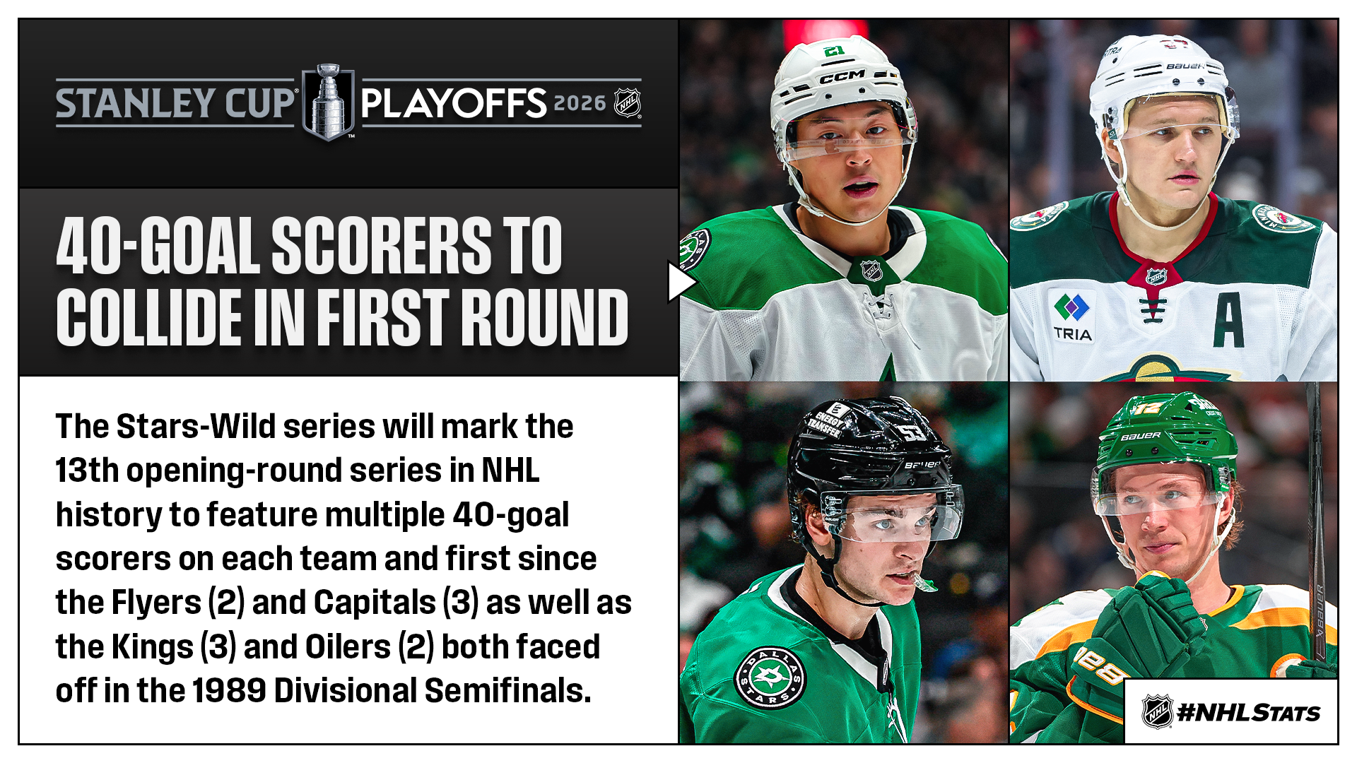 * A preview of the only confirmed 2026 First Round matchup pits Dallas (46-20-12, 104 points) against Minnesota (45-21-12, 102 points) as they battle for the No. 2 seed in the Central Division in home ice in their third all-time playoff meeting. The Stars are 19-9 in series they start as the home team since 1993-94 when the franchise moved from Minnesota to Dallas, while the Wild are one of four clubs in League history that has claimed all of its series wins as the lower-ranked team (4 of 4).