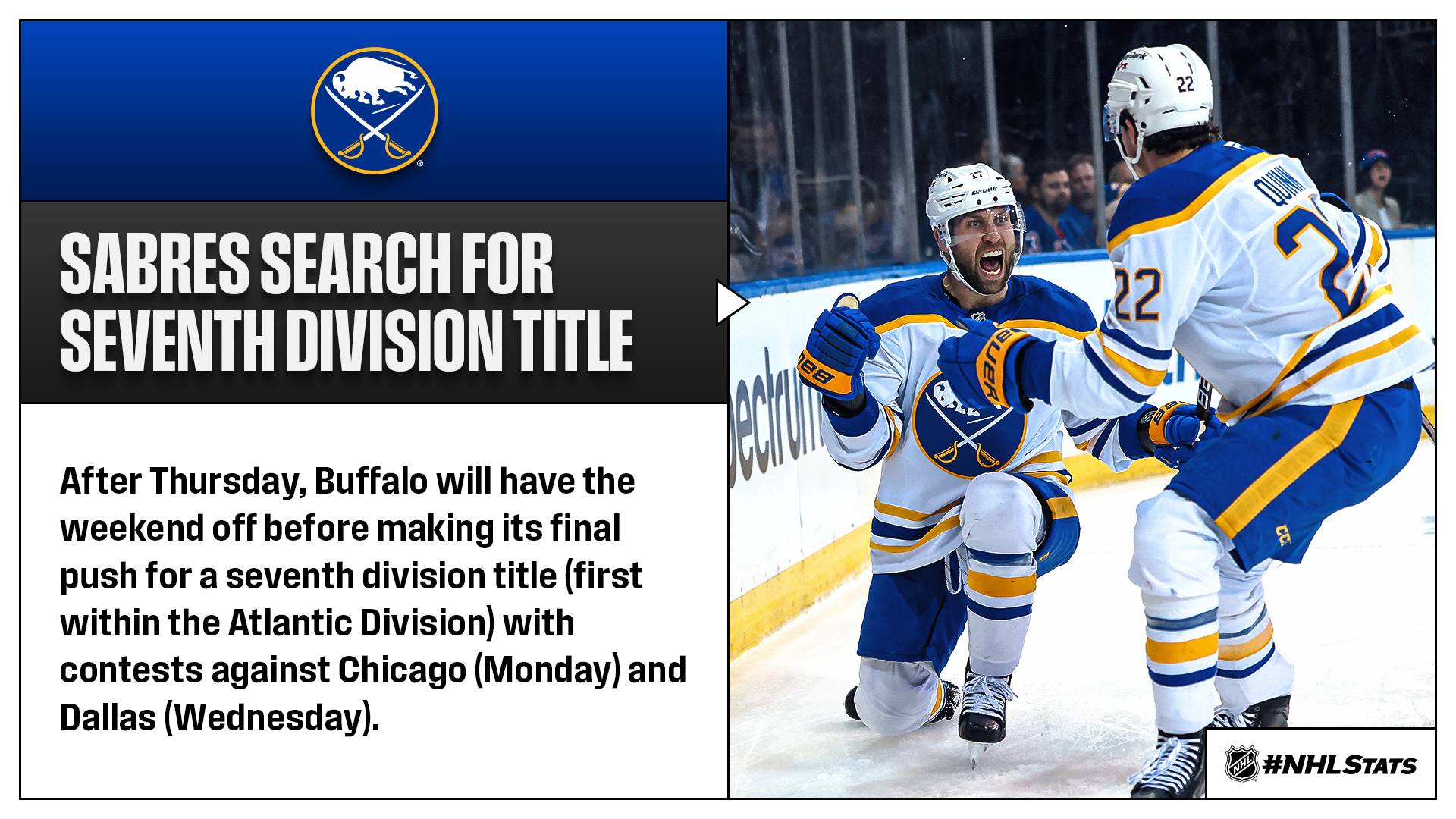 * Buffalo also created distance in its pursuit of its first division title in more than 15 years after its contingent of playoff veterans sparked a third-period rally at Madison Square Garden.