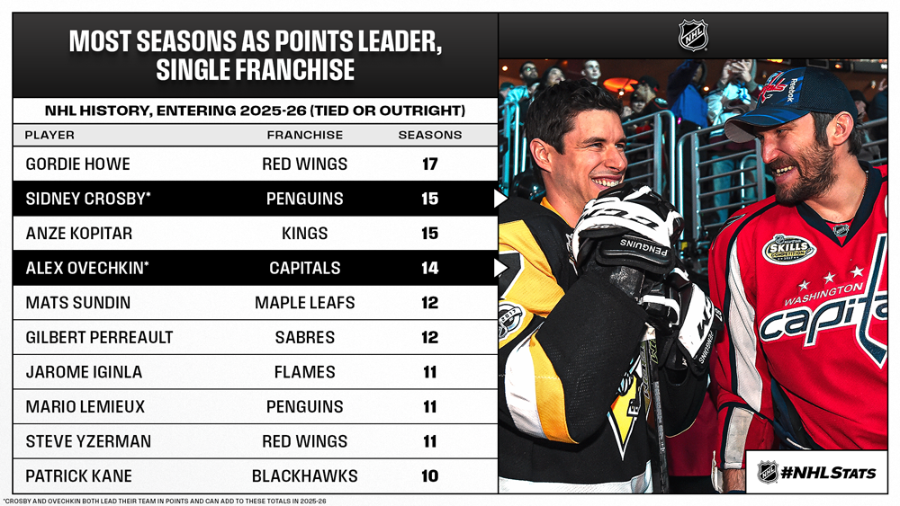 * Crosby and Ovechkin – who in their 21st seasons both lead their team in points this season – are set to square off in their 100th and 101st all-time head-to-head meetings (including playoffs) this weekend on back-to-back national telecasts in the U.S. (ABC on Saturday, TNT on Sunday). To mark the occasion, the latest #NHLStats Pack provides a Sid vs. Ovi 101.