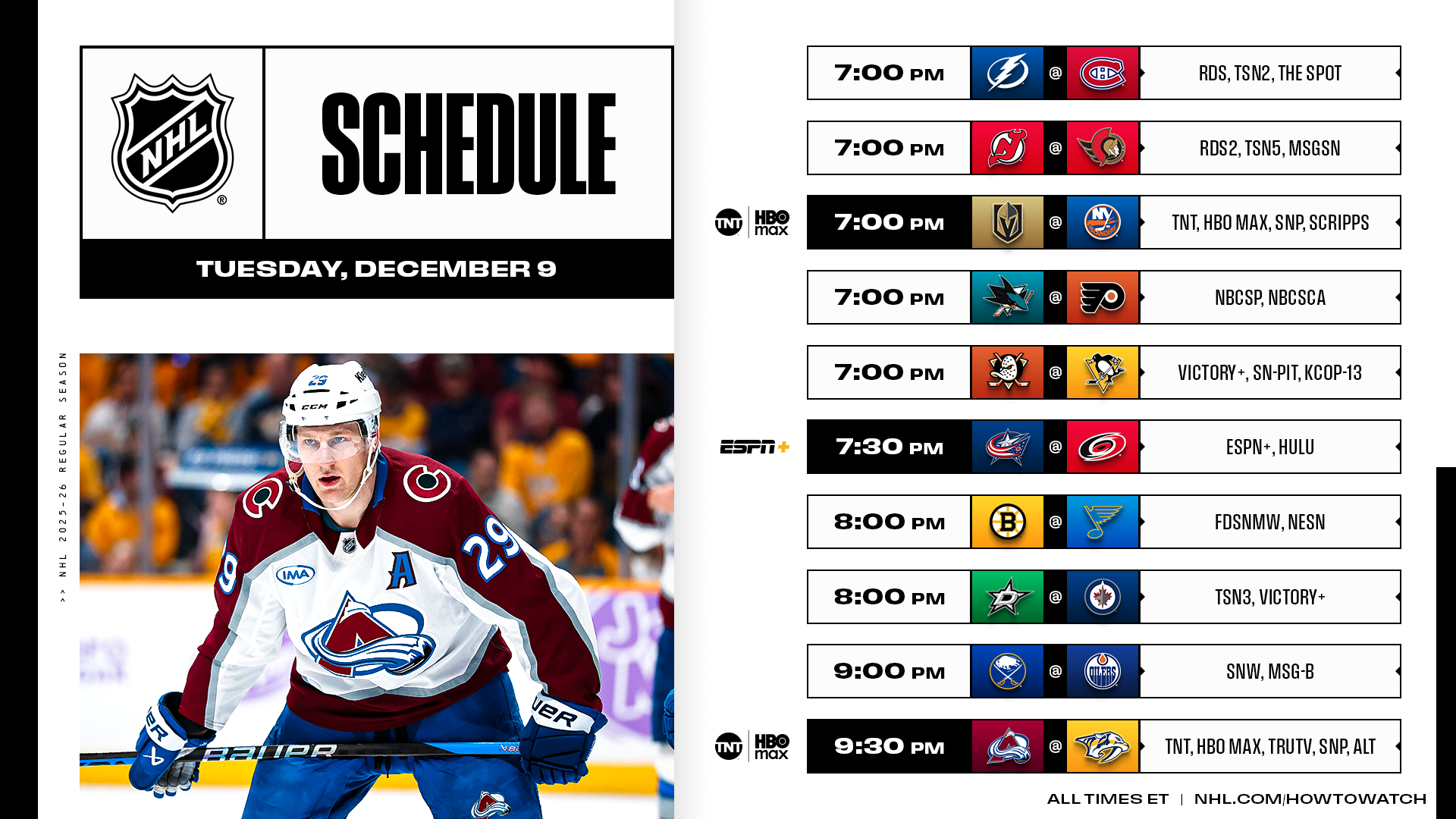 Tuesday’s 10-game slate includes an NHL on TNT doubleheader as Matthew Schaefer and the Islanders (16-11-3, 35 points) host the Golden Knights (14-6-8, 36 points) before the Predators (10-14-4, 24 points) welcome Nathan MacKinnon and the Avalanche (21-2-6, 48 points), who can become the first player and team to reach 50 points this season.