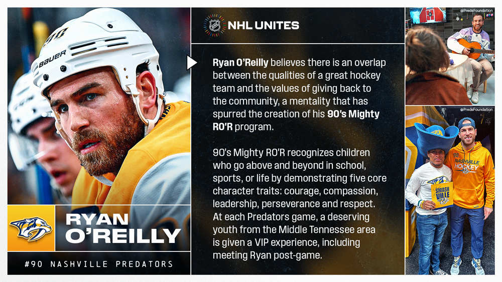 * Ryan O’Reilly (9-12—21 in 28 GP) is currently leading the Predators in scoring and has been a leader in the community throughout his 17-season NHL career. O’Reilly, who was Nashville’s King Clancy nominee last season, says he’s happiest when he’s involved in improving outcomes for other people, from foster kids to community leaders and other causes closer to his heart. Last May, O’Reilly penned a blog post on NHL.com explaining his advocacy for foster care.
