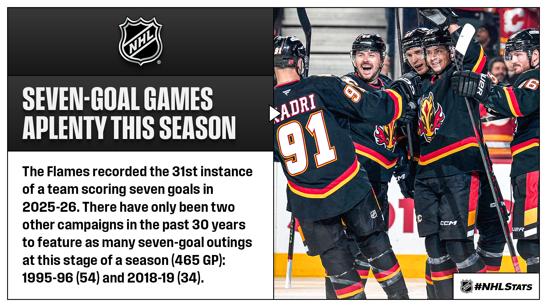 The Flames accounted for a number of notes in #NHLStats: Live Updates on Monday as they scored seven goals in a game for the first time since Nov. 24, 2023 and extended their home point streak to six contests (5-0-1). Calgary accounted for the third straight day of a team scoring seven times after Florida did so Saturday and Anaheim on Sunday.