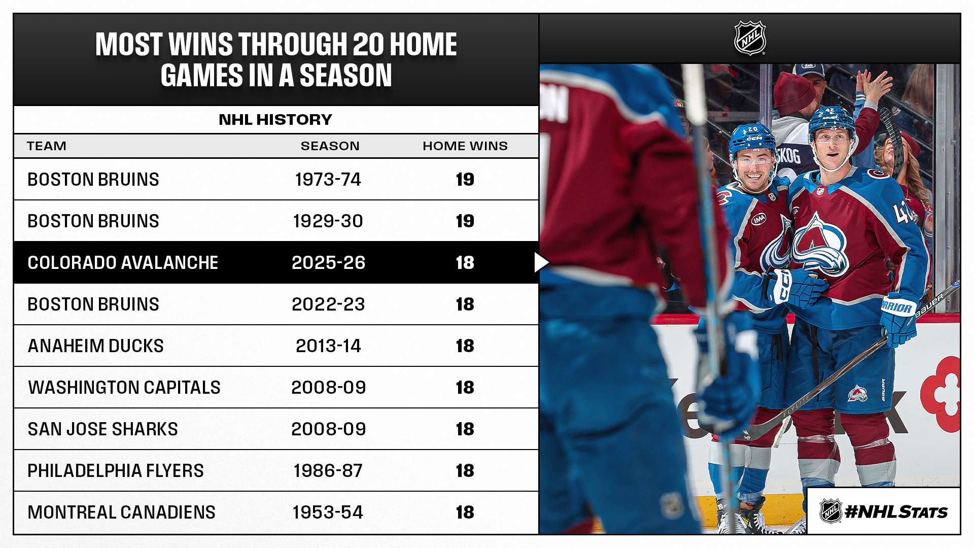 * Nathan MacKinnon reclaimed the scoring lead with a four-point night that saw Colorado score eight goals through the first two periods. In the process, the Avalanche extended their home winning streak to 16 games – tied for the sixth longest in NHL history.