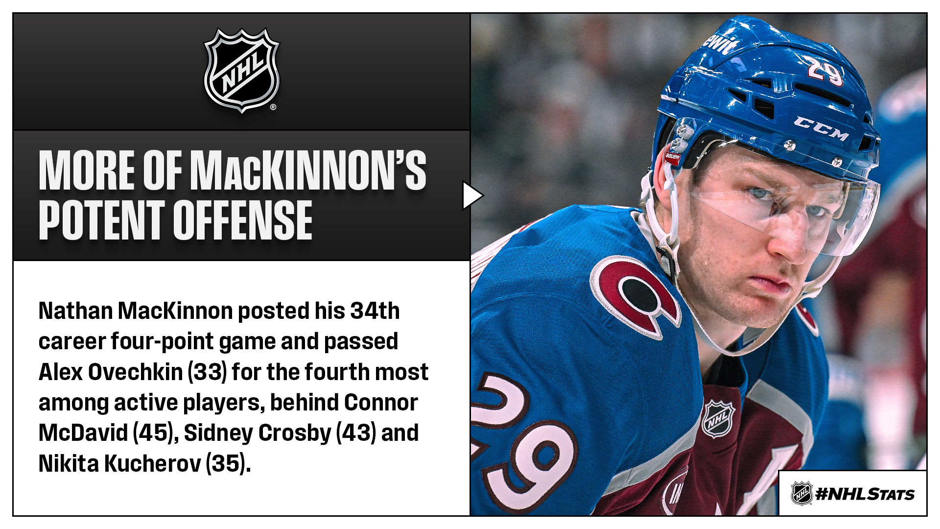* MacKinnon’s three-assist period was the ninth of his career, which tied Sidney Crosby and Nikita Kucherov for the most among active players and also matched Peter Stastny for the most in franchise history.
