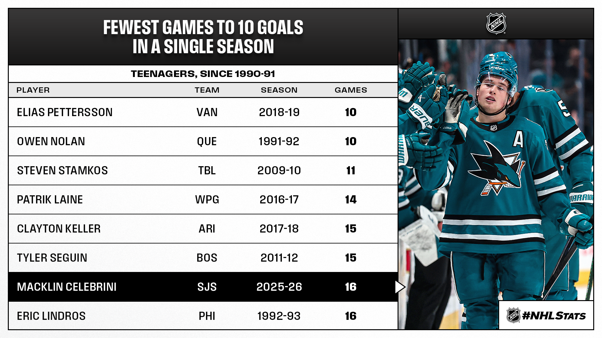 * Macklin Celebrini scored his 10th goal of the season and became the fourth teenager in the past decade to hit a double-digit total in 16 contests or fewer. The Sharks, who defeated the Jets on Friday and the Panthers on Saturday, became the seventh team in NHL history to defeat the reigning Presidents’ Trophy winner and Stanley Cup champion on consecutive days (any order) and first since the 2016-17 Red Wings (Feb. 18-19, 2017).