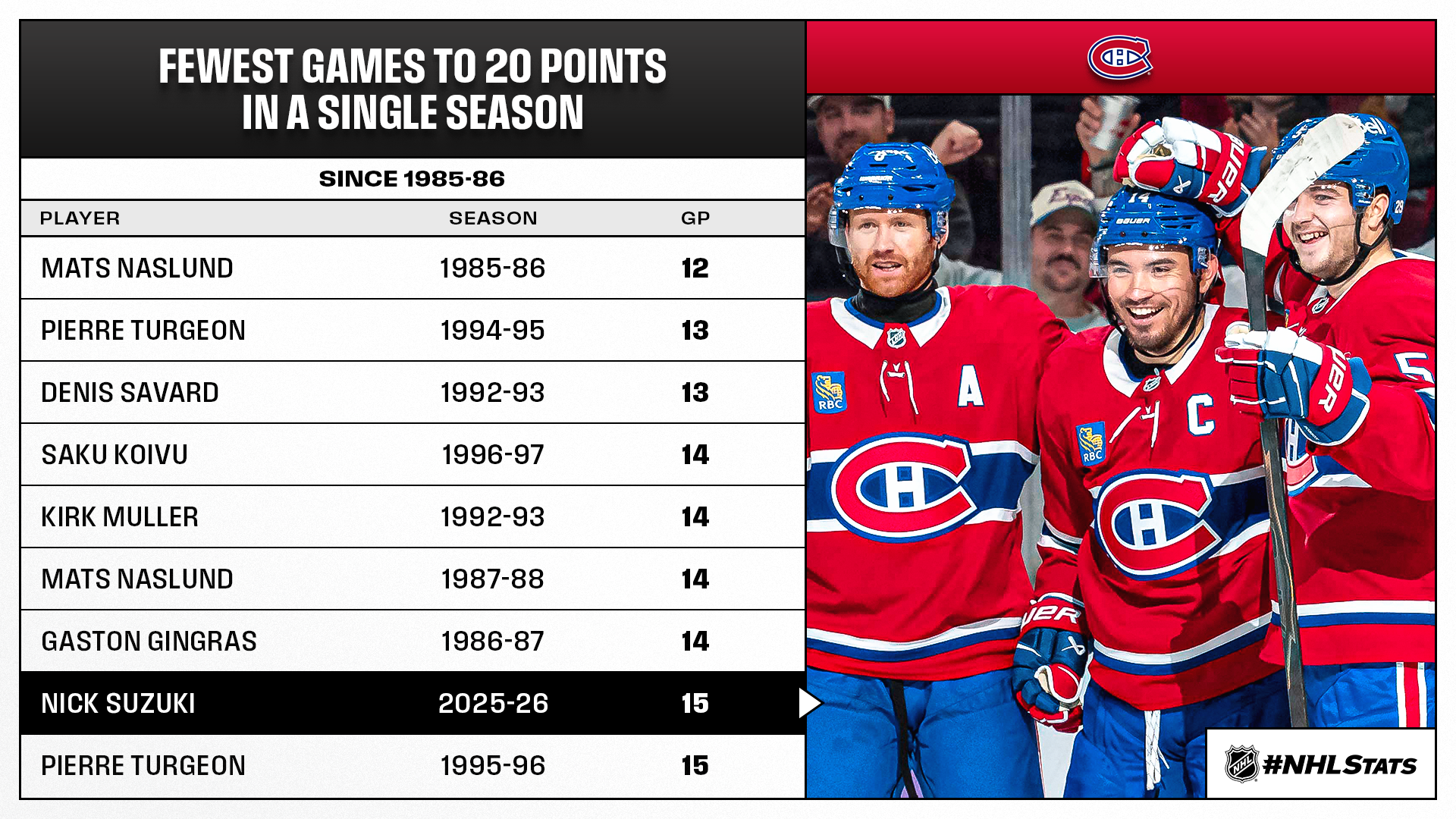 * Suzuki (4-16—20 in 15 GP), who has found the score sheet in each of Montreal’s first seven home games of the season, required the fewest games by a Canadiens player to hit 20 points in a single season since franchise icon Saku Koivu (14 GP in 1996-97).