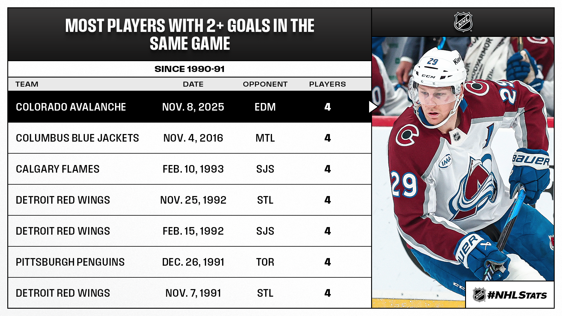 * MacKinnon (12-12—24 in 15 GP) tied Macklin Celebrini (10-14—24 in 16 GP) for the League lead in scoring thanks to his 30th career four-point game, two shy of Joe Sakic (32) for second most in Avalanche/Nordiques history. Since MacKinnon debuted in 2013-14, only two players have as many four-point outings: Connor McDavid (41) and Nikita Kucherov (33).