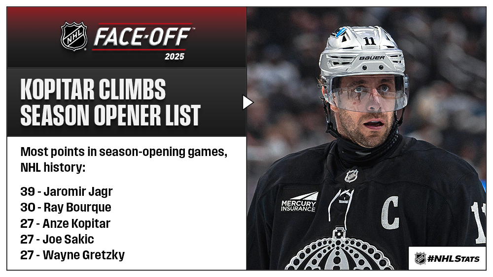 The 2025-26 opening night edition of #NHLStats: Live Updates featured several notes from across the three-game slate, including Kings captain Anze Kopitar boosting his career totals in season-opening contests to 12-15—27 (19 GP) after receiving a standing ovation from fans in the final home opener of his career.