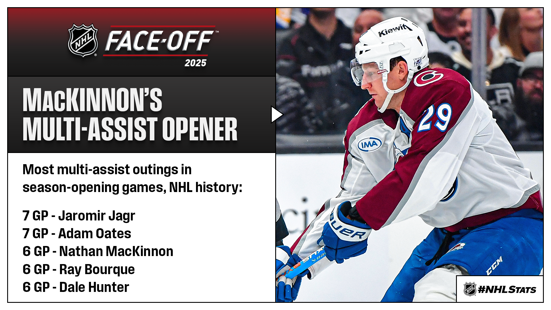 * Nathan MacKinnon and Cale Makar both opened 2025-26 with multi-point performances for the fourth straight season en route to an Avalanche victory over the Kings.