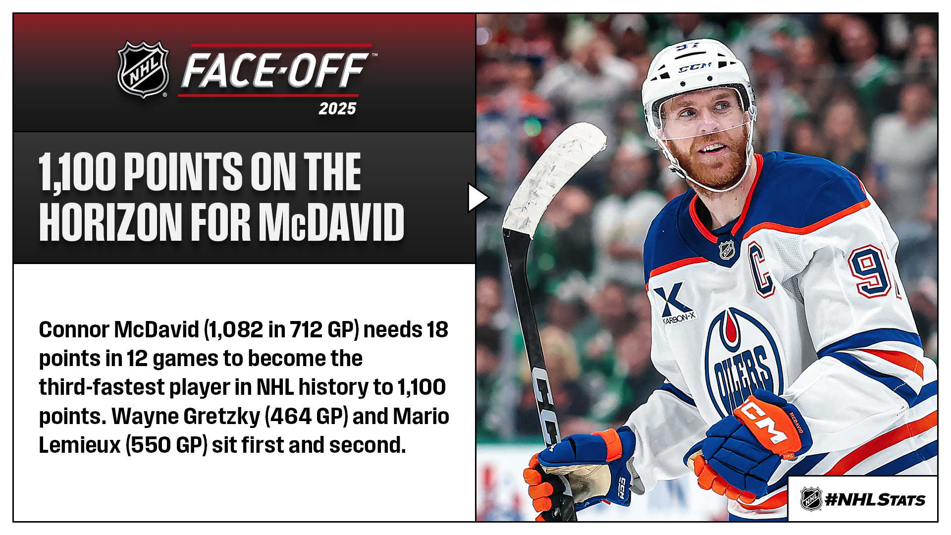 * Connor McDavid, fresh off a new two-year contract extension, and the Oilers have advanced to the Stanley Cup Final in each of the past two seasons. A model of offensive consistency throughout his tenure with the Oilers and 18 points shy of 1,100 in his career (361-721—1,082 in 712 GP), McDavid can join rare company with a sixth consecutive 100-point season in 2025-26 and tie the second-longest stretch in NHL history. A ninth career 100-point campaign would also give McDavid the third most in League history, behind only Wayne Gretzky (15) and Mario Lemieux (10).