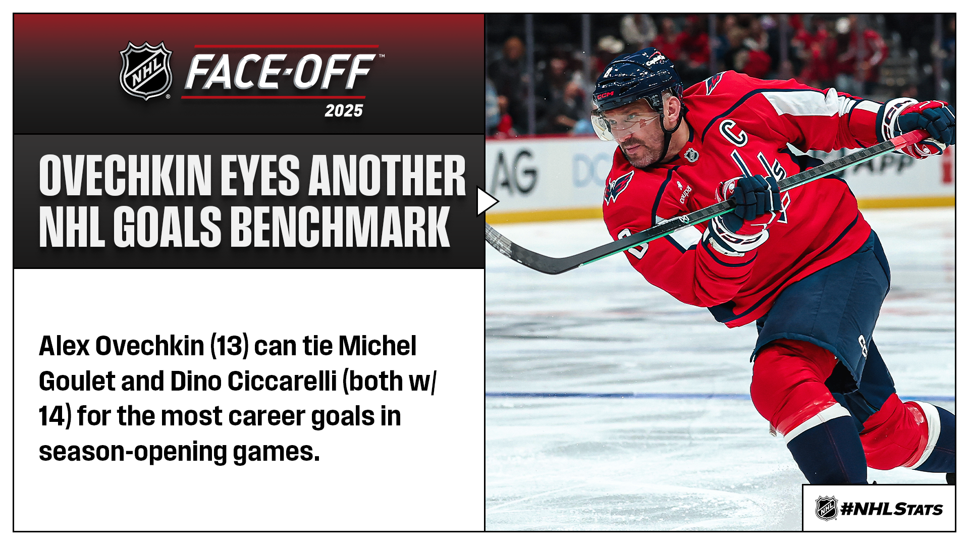 * Now with the NHL goals record freshly imprinted on his resume, Ovechkin (897-726—1,623) enters 2025-26 with another distinction in sight: the first player in League history to score 900 career goals. He can hit the milestone with a hat trick to open the season – a feat he accomplished once before (Oct. 5, 2017). The Capitals’ captain, however, would only need one goal Wednesday to put his name atop and tie another League benchmark: the most career goals in season-opening games.