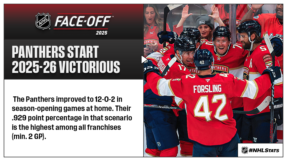 * The Panthers, who staged five come-from-behind victories during the 2025 Stanley Cup Playoffs, became the eighth reigning Stanley Cup champion in the NHL’s expansion era to register a comeback win in their season opener. The others: 2016-17 Penguins, 2013-14 Blackhawks, 1999-00 Stars, 1993-94 Canadiens, 1991-92 Penguins, 1977-78 Canadiens and 1970-71 Bruins.
